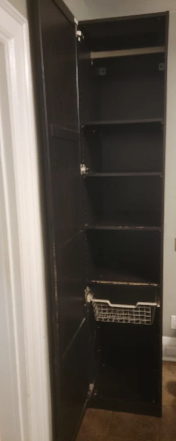 Selling a brown IKEA Pax wardrobe. It features multiple shelves and a wire basket for storage. Great for organizing your clothes and other items!