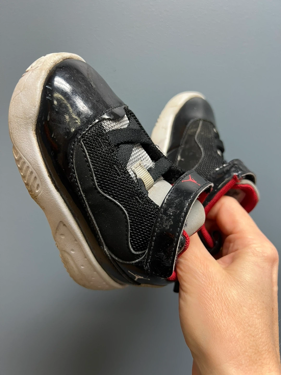 Selling a pair of Jordan toddler shoes in size 6C. They are black with red and grey accents. The soles have some wear, as shown in the photos, but they still have lots of life left!