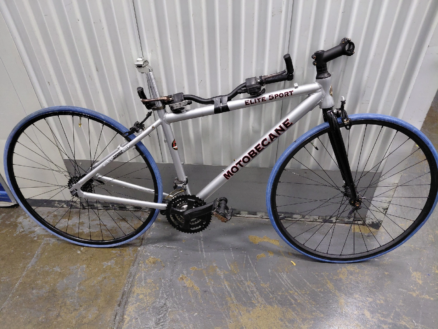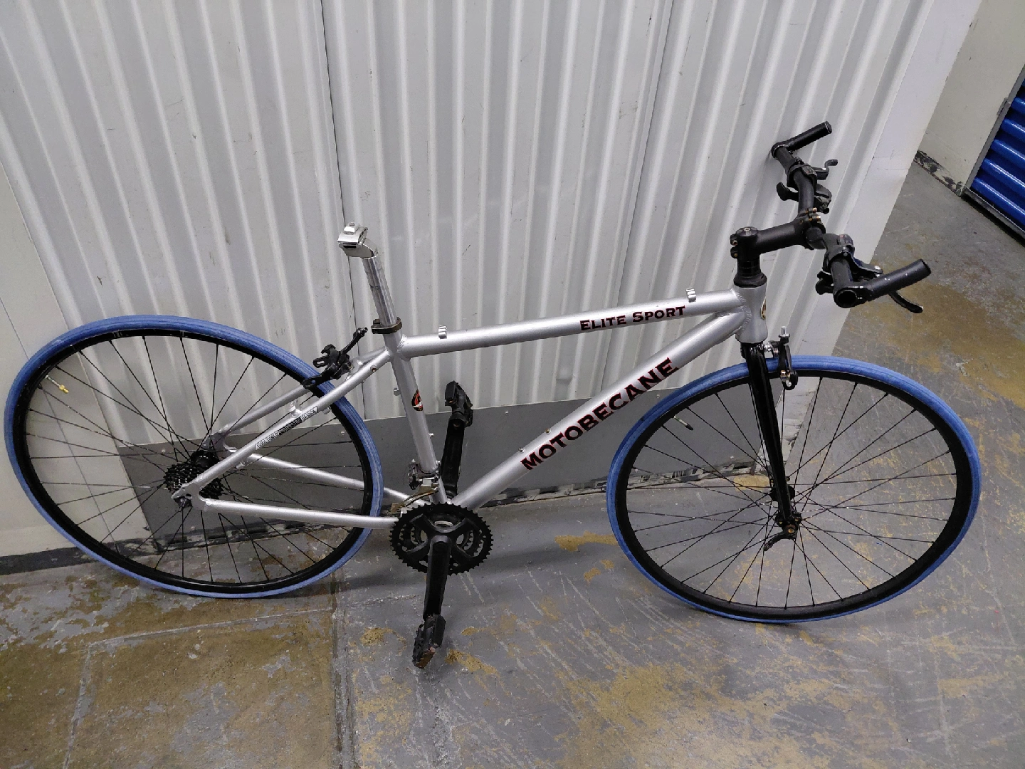 Selling a Motobecane Elite Sport road bike! It's silver with blue tires and looks to be in good condition. Perfect for someone looking for a reliable bike. This is a project bike and best for a person who knows how to build bikes.