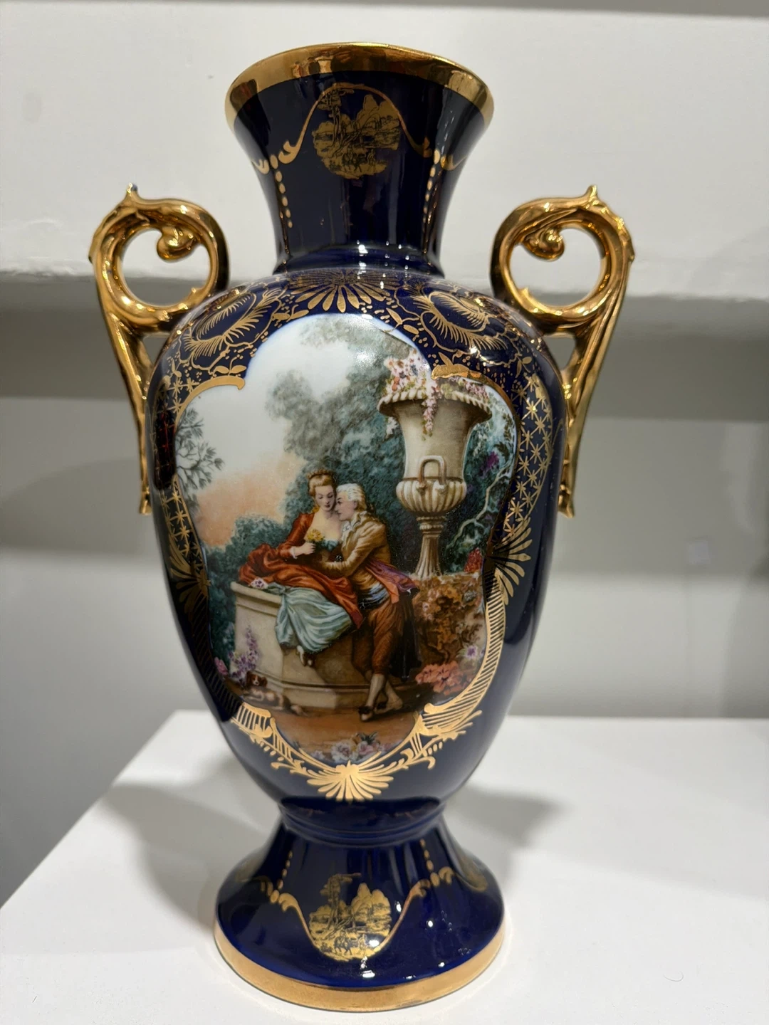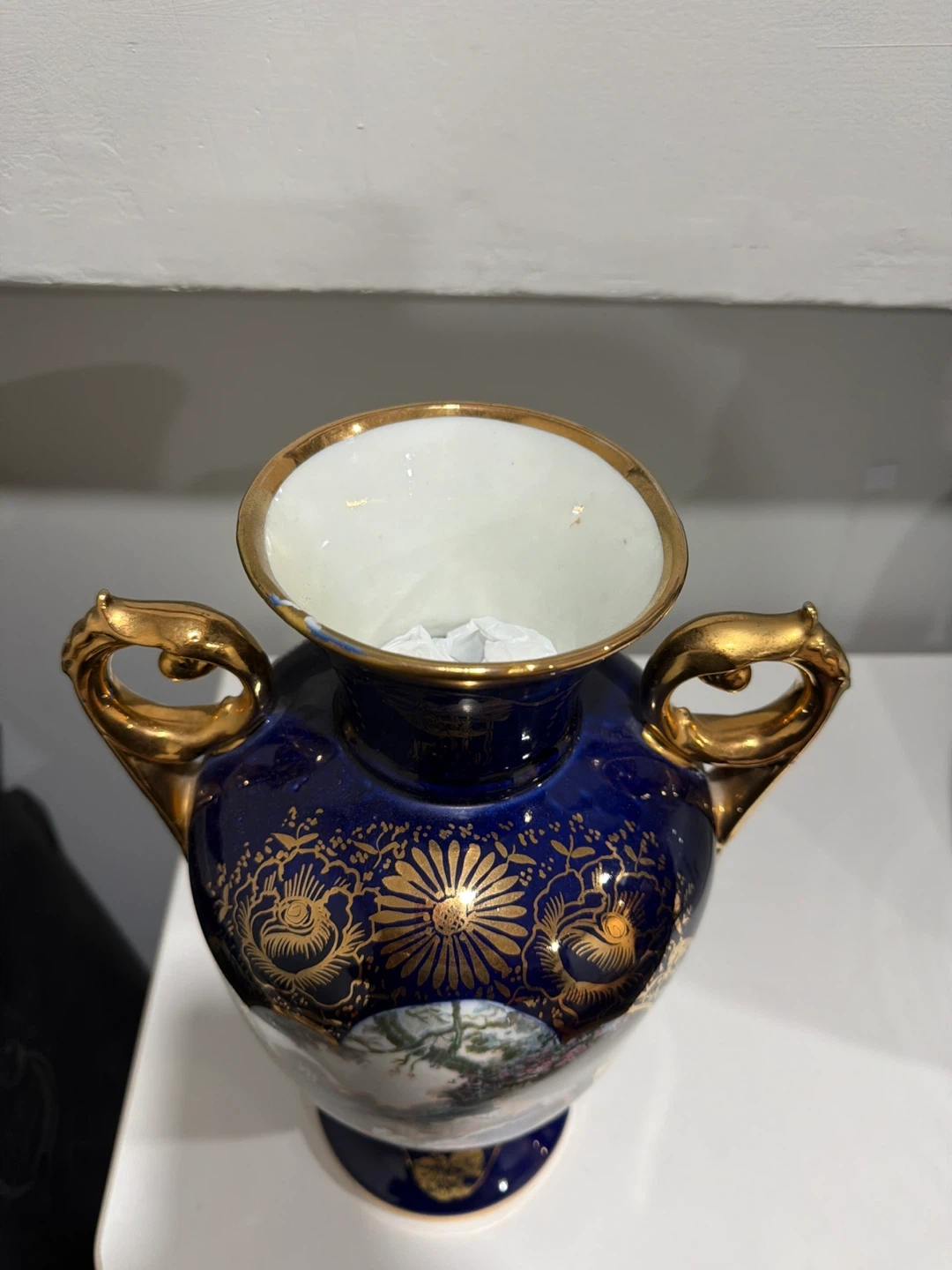 Selling a lovely vintage vase! It features a beautiful blue and gold design with ornate handles and detailed artwork. Perfect for adding a touch of elegance to any room!