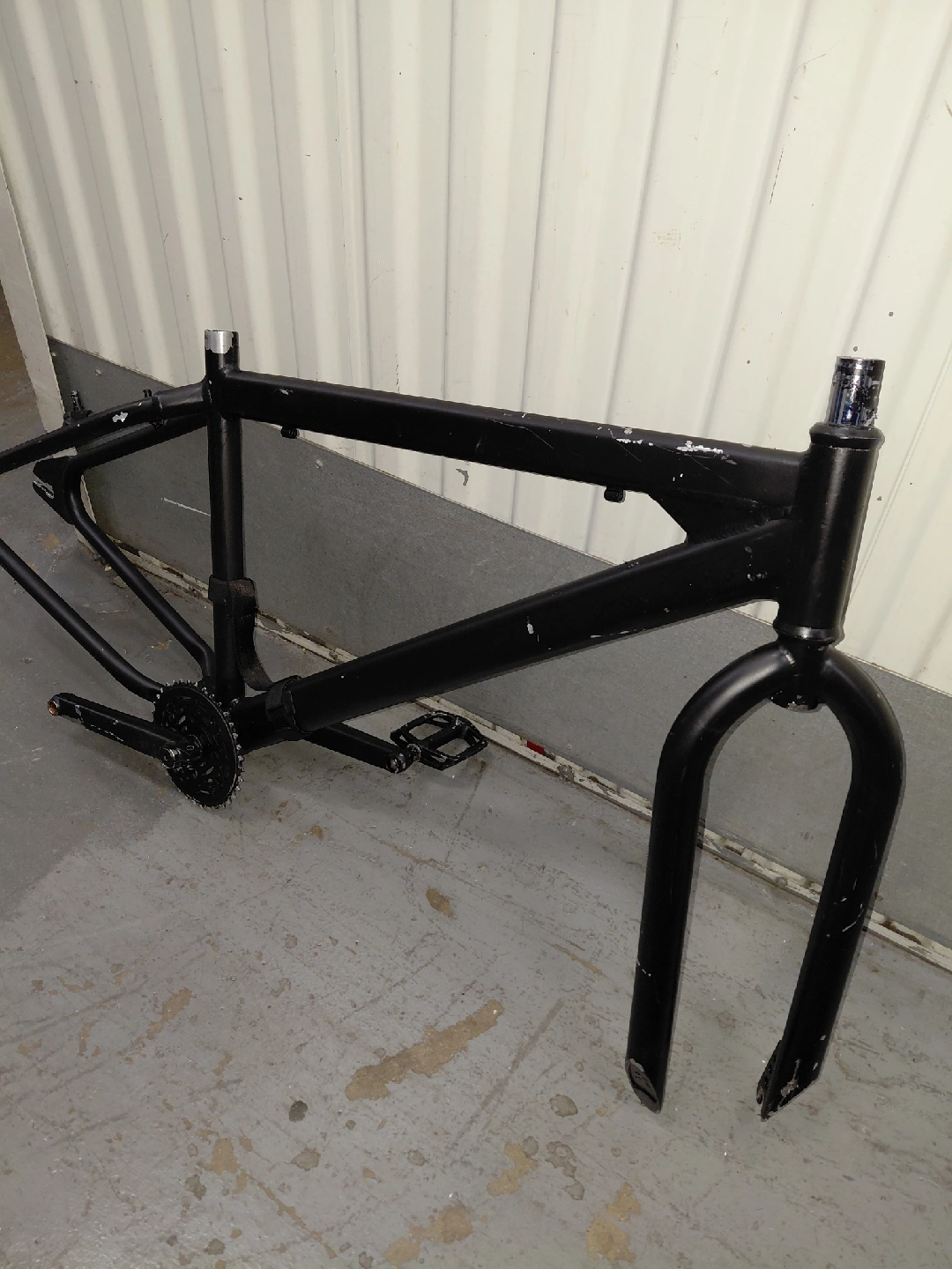 Selling a black BMX bike frame. It shows some signs of use, as pictured. Good for a project or replacement part! Big RIPPER model size Large if you know then you know.