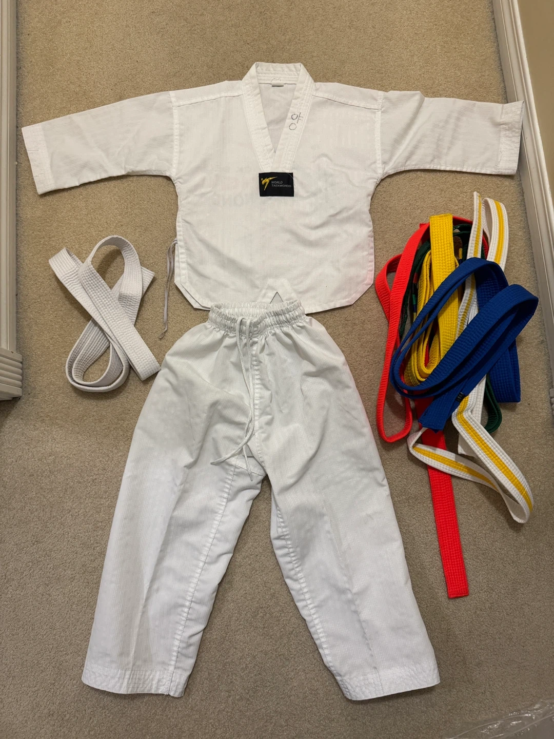 Selling a complete Taekwondo uniform set. Includes the jacket, pants, and a variety of belts representing different skill levels. Perfect for beginners or those advancing in their training!