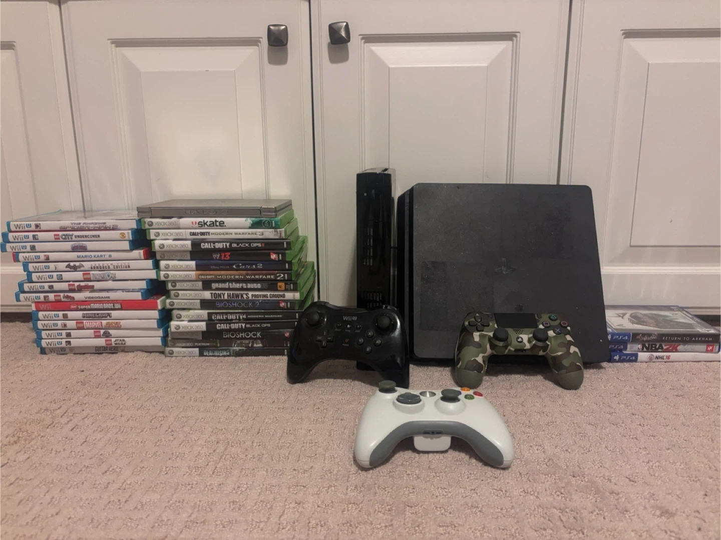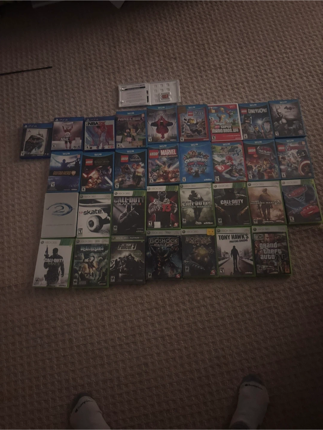 Selling a mixed lot of used video games for Wii U, Xbox 360, and PS4, as well as the PS4 upgraded to 1TB, Wii U and Xbox 360 controller. Great for expanding your collection or reliving some classics! Titles include Call of Duty, Lego, Mario Kart, and more. Condition varies, but all games are tested and working. I