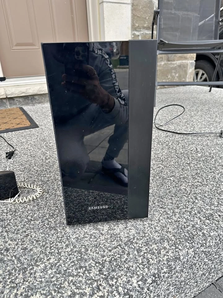 Experience powerful, crystal-clear sound with this shiny black soundbar and subwoofer combo.