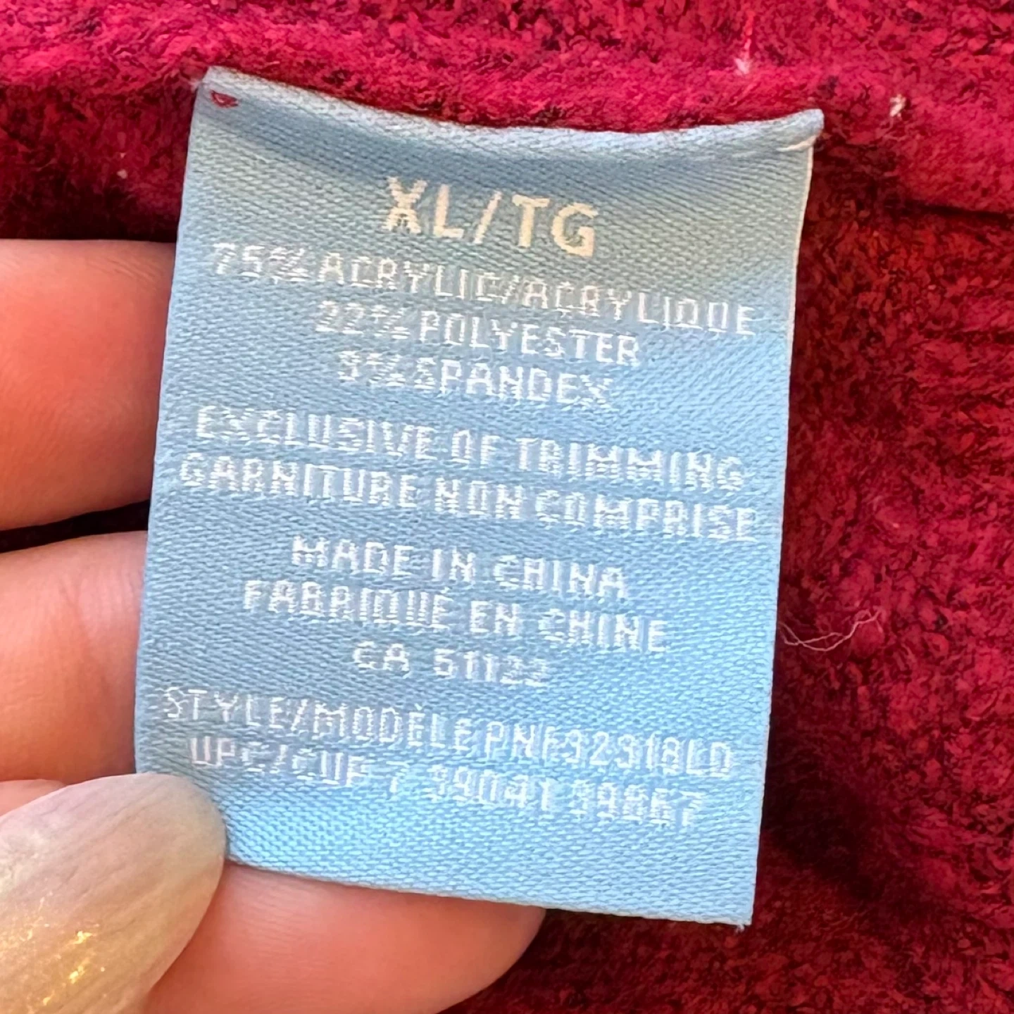Material: 75% Acrylic, 22% Polyester, 3% Spandex