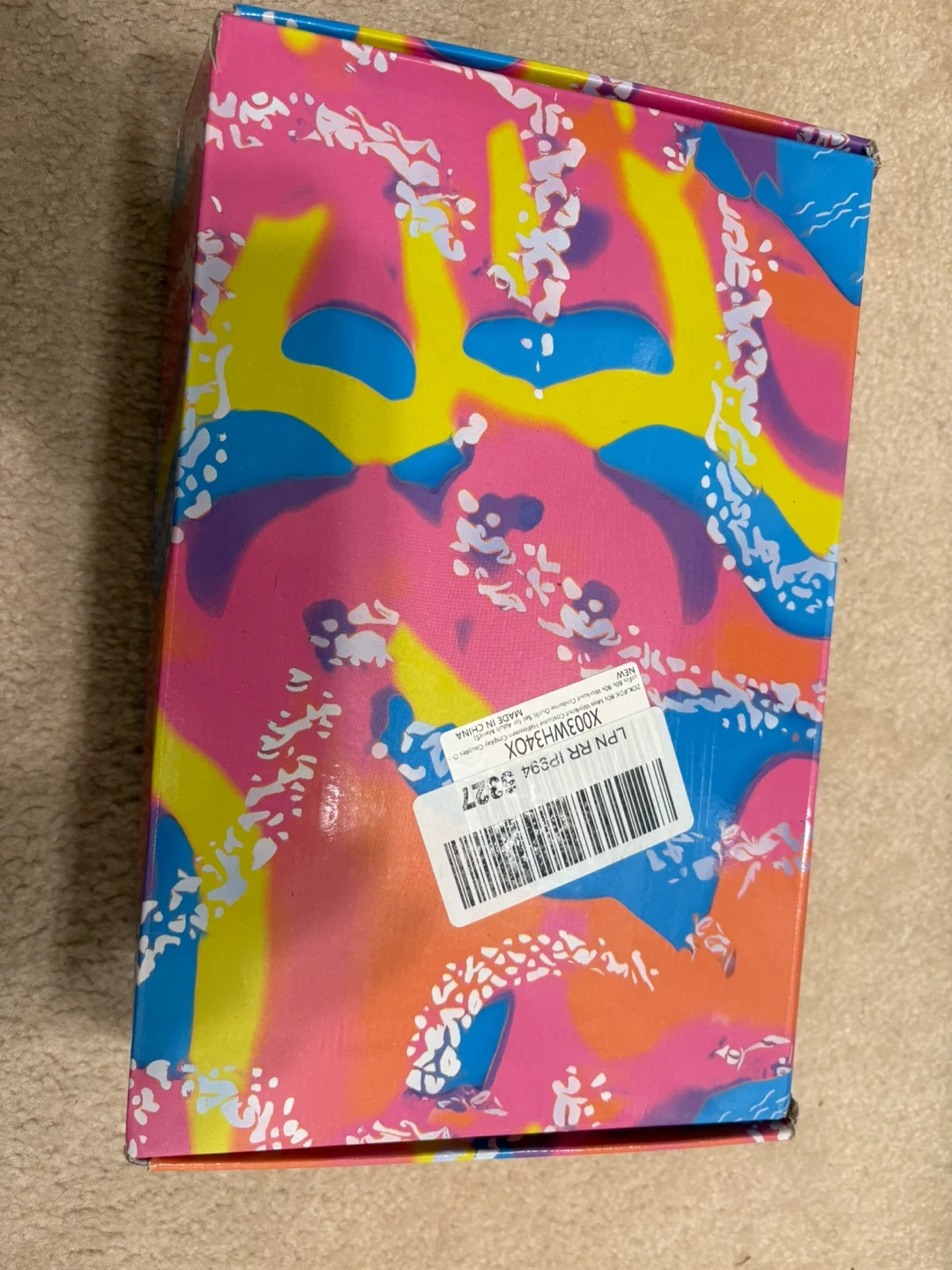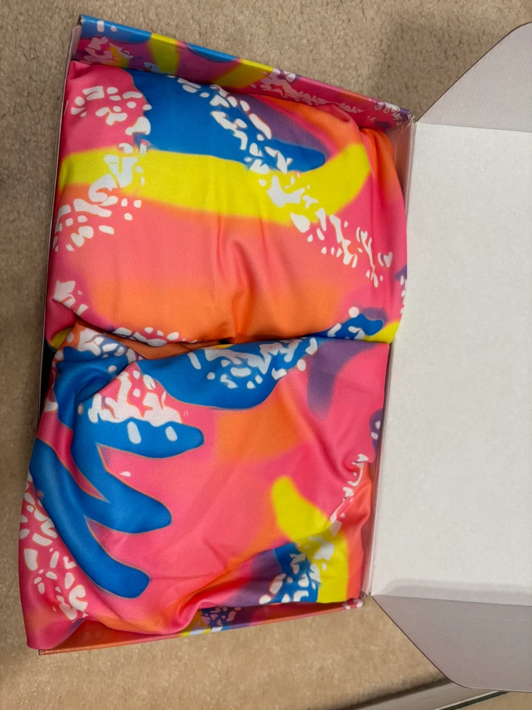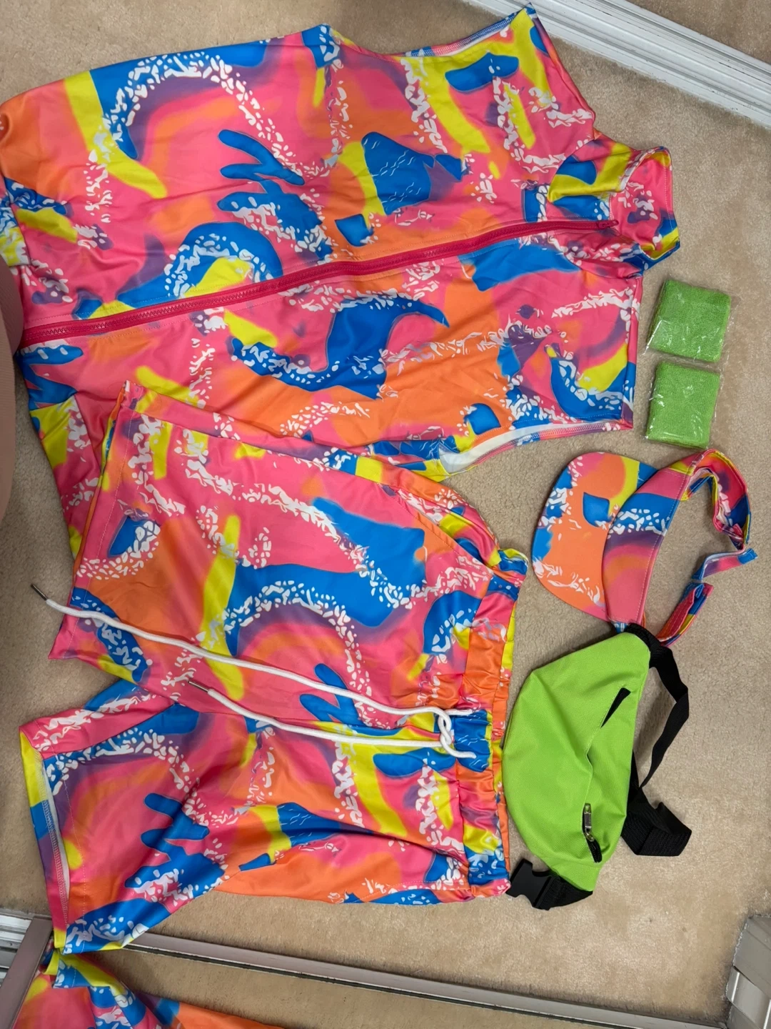 10Brand new, never worn 4-piece outfit set! This set includes a zip-up jacket, shorts, a small purse, and a green fanny pack. The main colours are pink, blue, and yellow in a vibrant pattern. Comes in the original box!