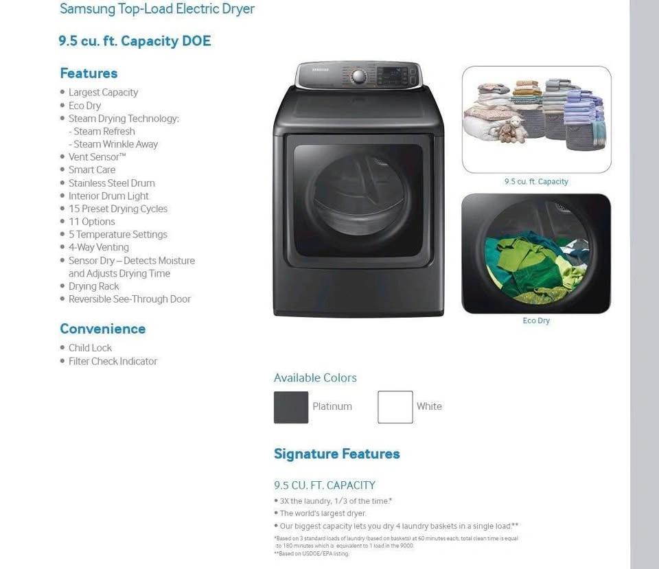 This massive 9.5 cu. ft. beast could probably dry your clothes and your tears after folding laundry. Itβs basically the SUV of dryers β spacious, powerful, and ready to handle whatever life (or your kids) throw in it.