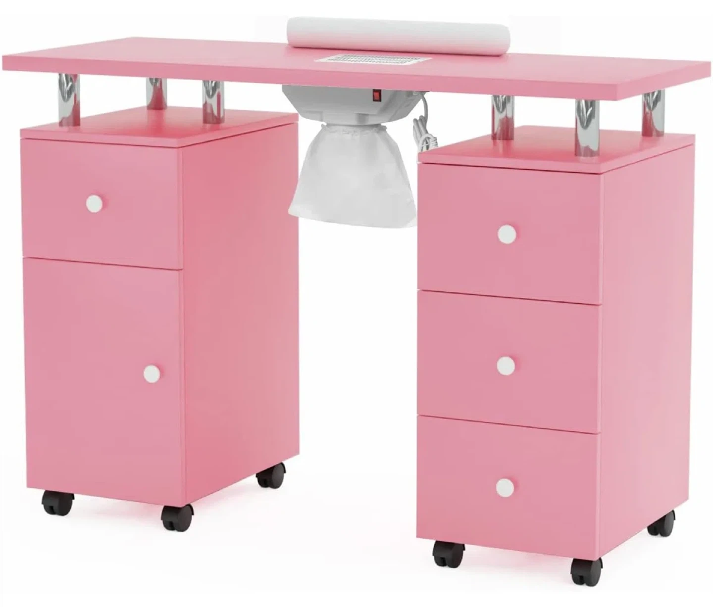 Looking to upgrade your nail salon setup? This pink manicure table is perfect! It comes with a built-in dust collector to keep your workspace clean and tidy. The table also features ample storage space with 4 drawers and 1 cabinet, so you can keep all your tools and supplies organized. The dimensions are 42.5" x 11.8" x 29.9".