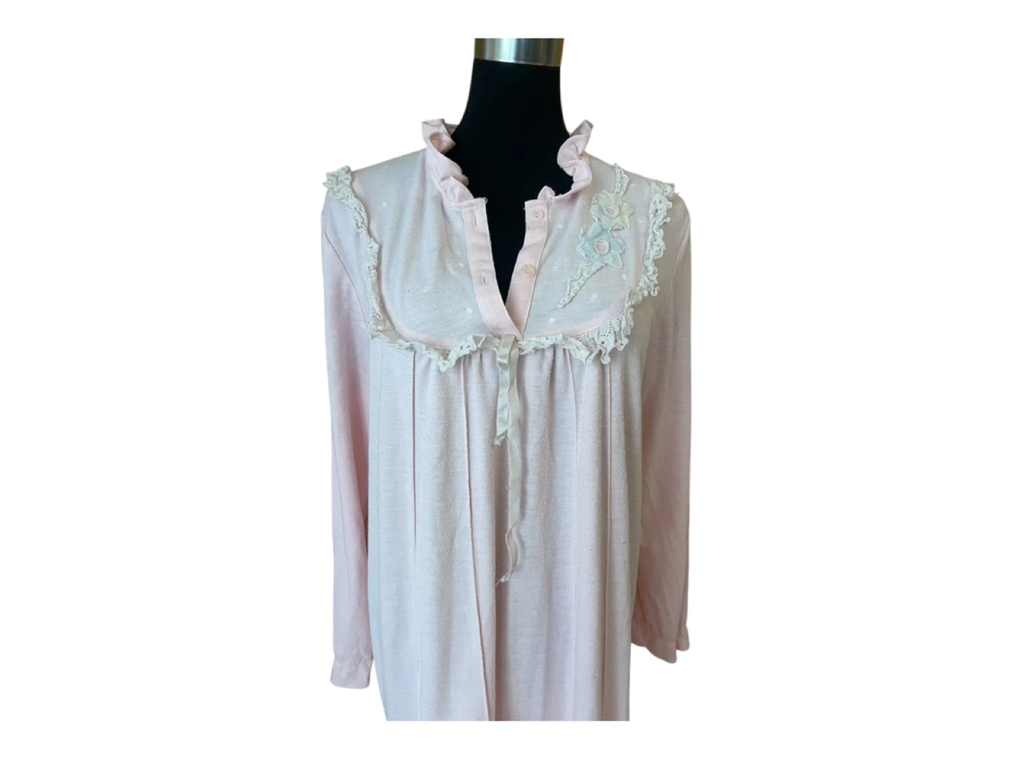 RARE Vintage 80s Pink Nightgown Dress Cotton Ruffle Details Button Up Collar S/M