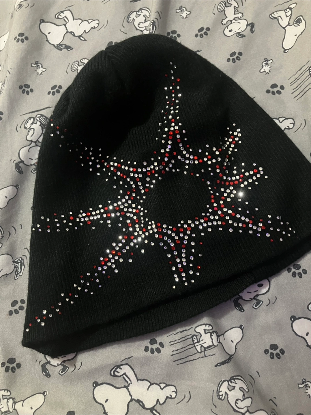 This is a black beanie with a cool red and white rhinestone design! It's perfect for adding a bit of sparkle to your outfit on a chilly day