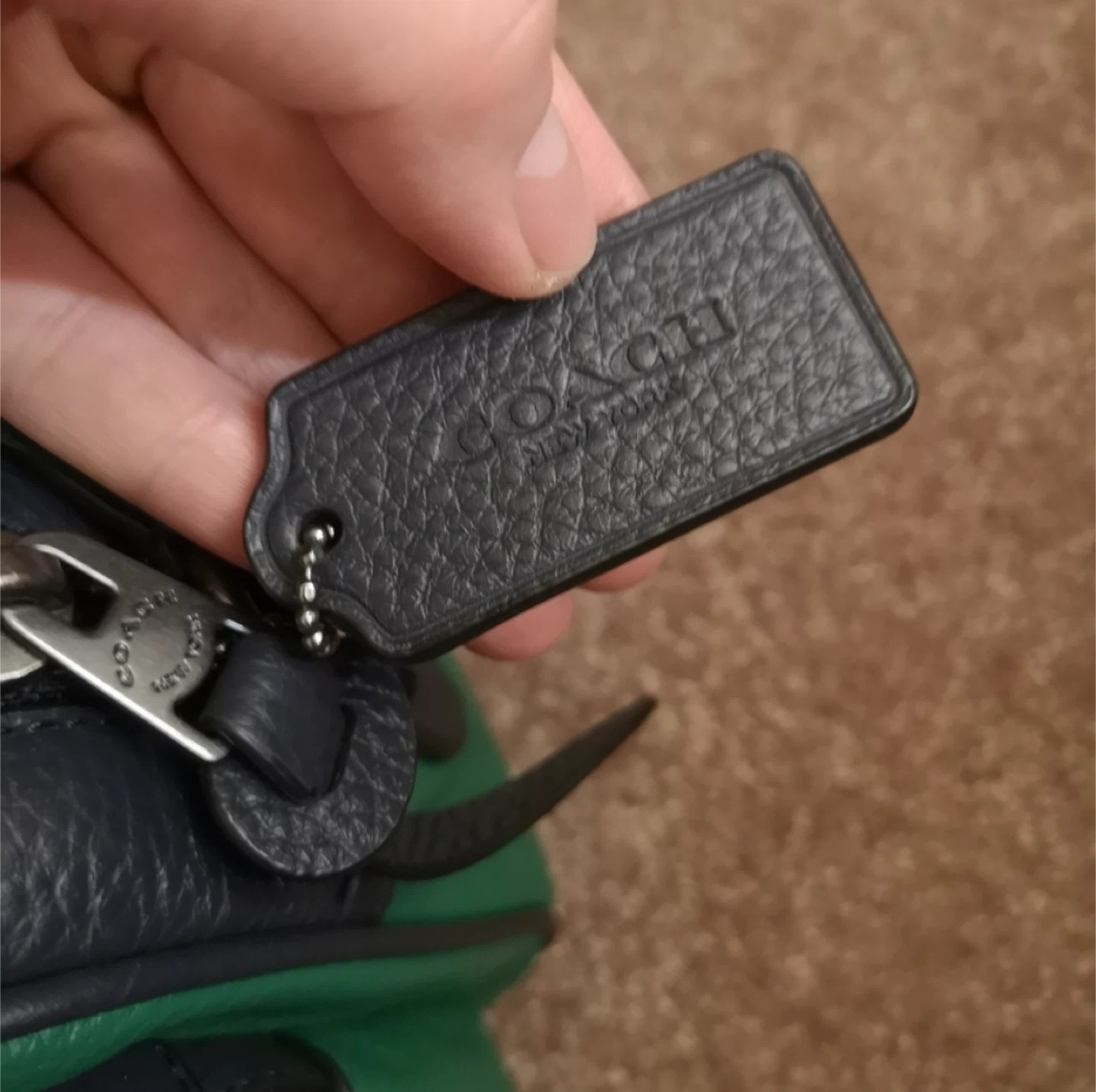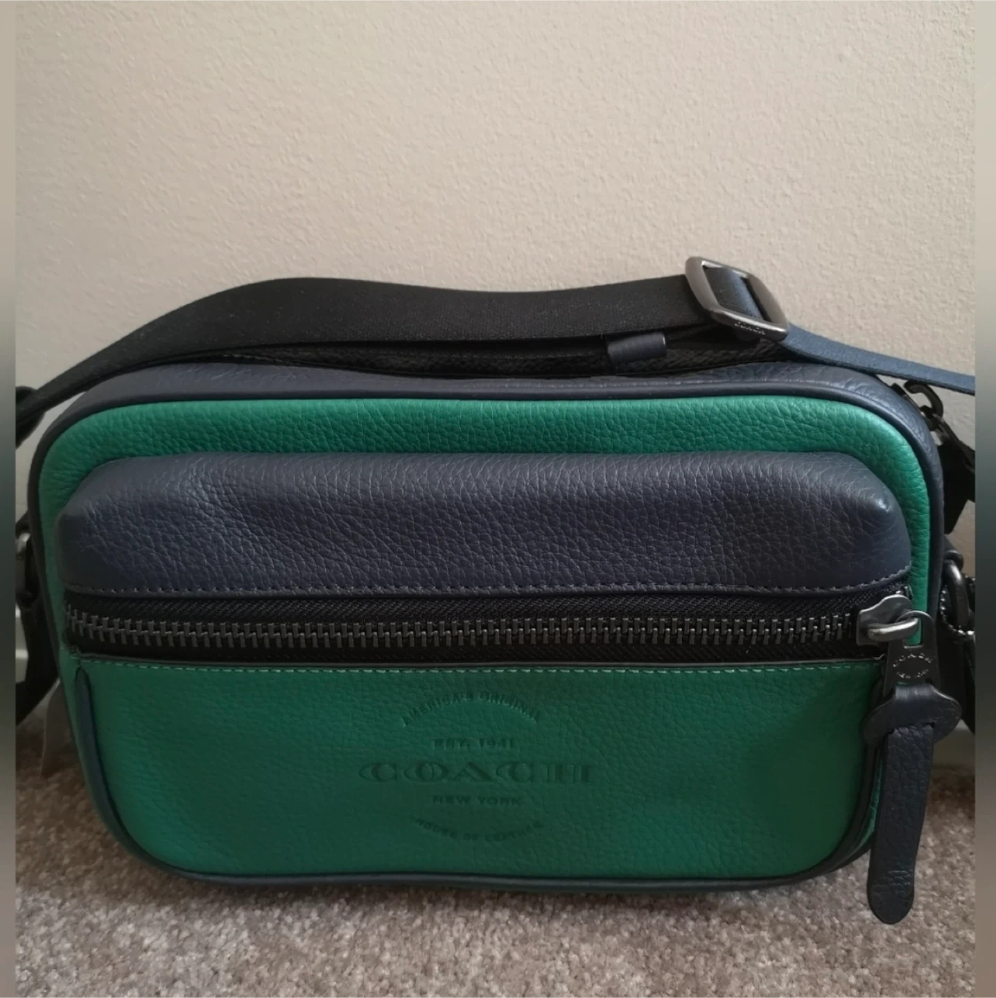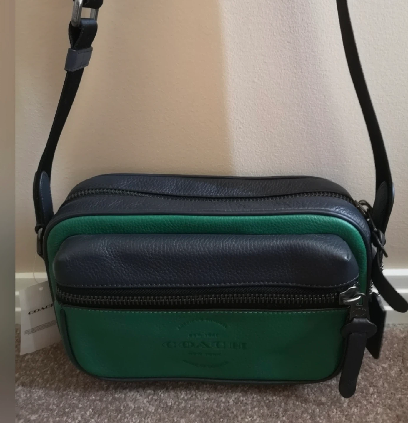 Selling a Coach crossbody bag in a stylish green and grey colour combination! It's made of leather and features a comfortable strap. Perfect for everyday use!
