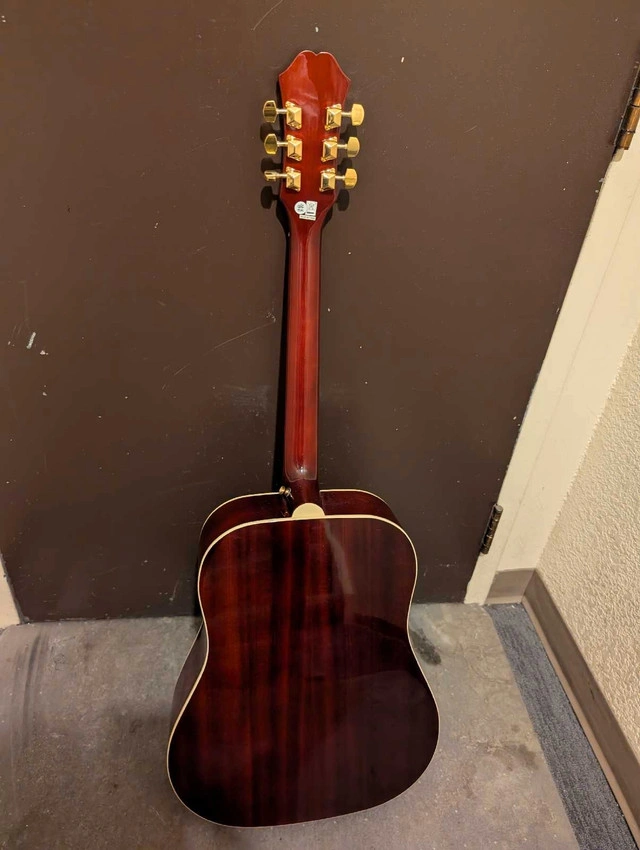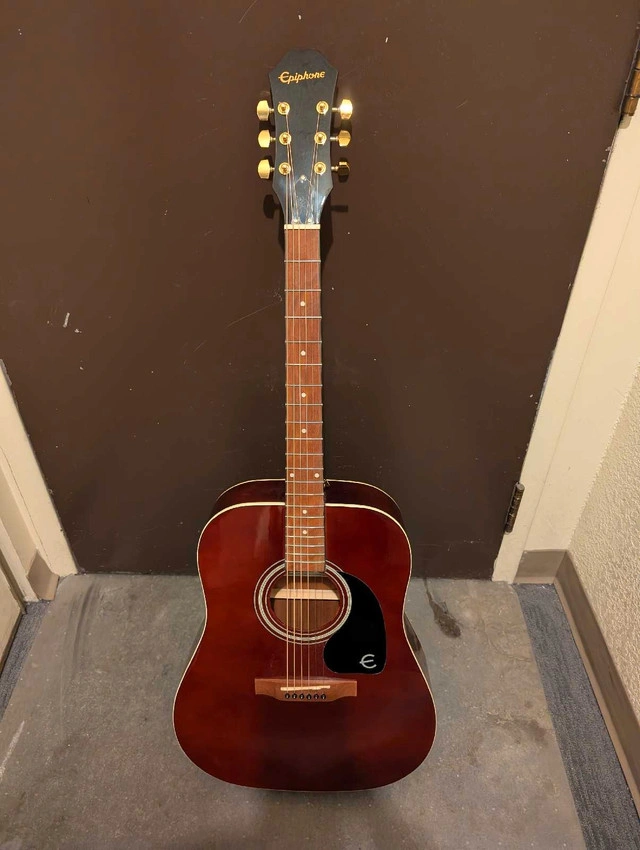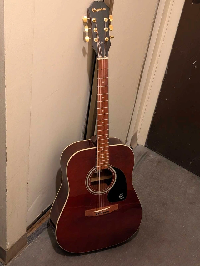 This red full-size Epiphone acoustic guitar is like new in excellent condition and comes with an OnStage case that includes back straps. It's a beautiful instrument with a rich sound, perfect for both beginners and experienced players. This guitar has been well-maintained and is ready to be played! If the ad is up, it's available!
