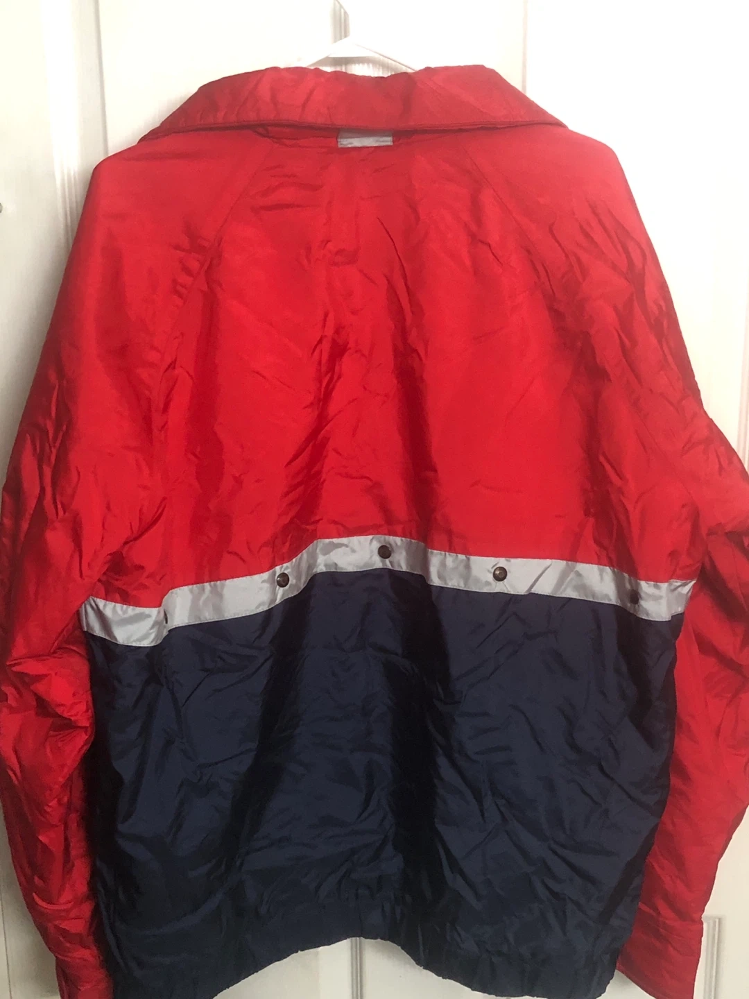 Selling a Dilrani Designs jacket in a vibrant red and blue colour block design. It's a size 46 and features Entrant fabric. Perfect for layering or outdoor activities!