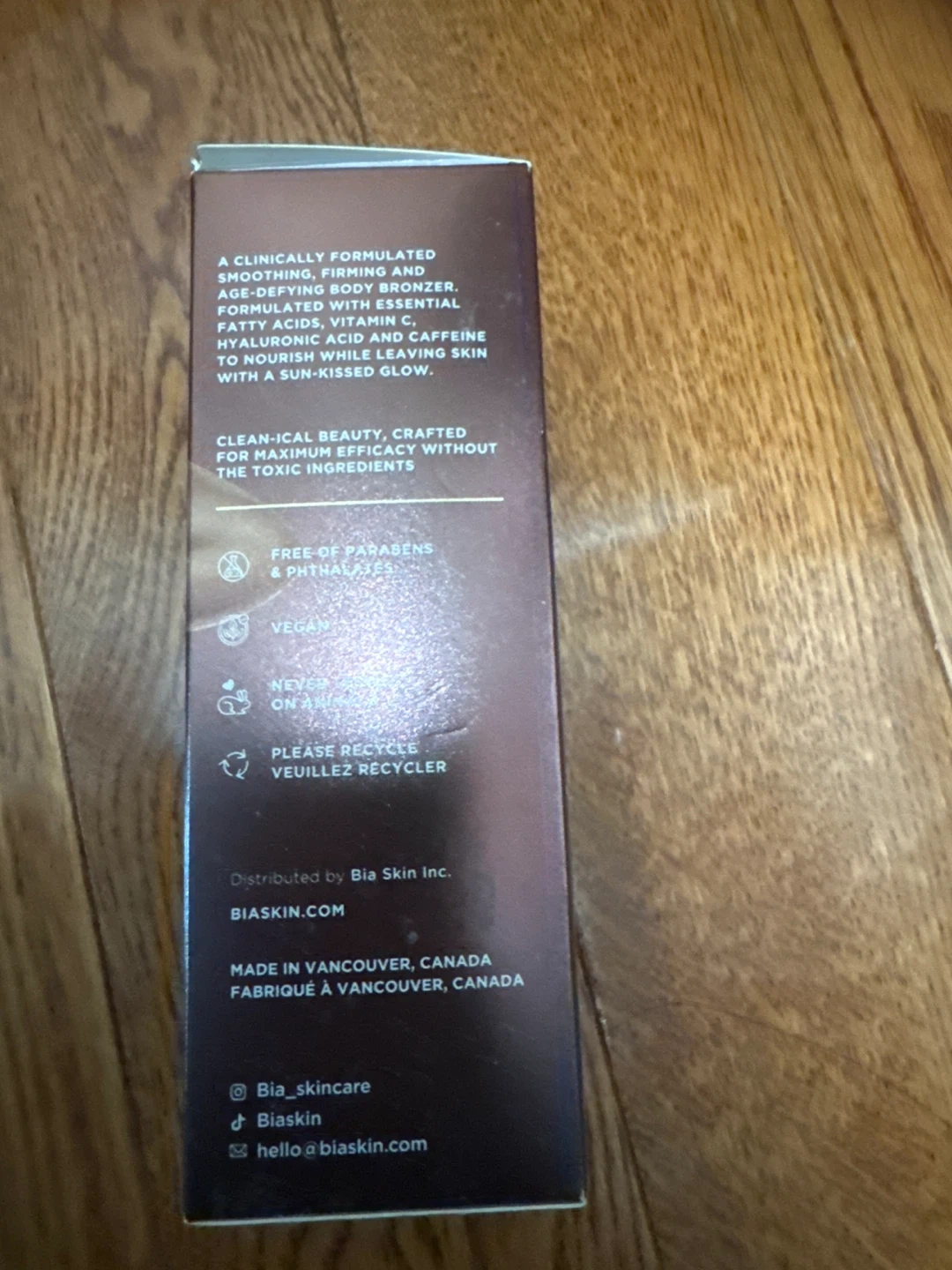 Selling a BIA Skin Ink Golden Hour Bronzing Creme in the Dark shade. This creme is formulated with essential fatty acids, Vitamin C, hyaluronic acid and caffeine to nourish while leaving skin with a sun-kissed glow. It's also free of parabens and phthalates. The box includes directions for use in both English and French.