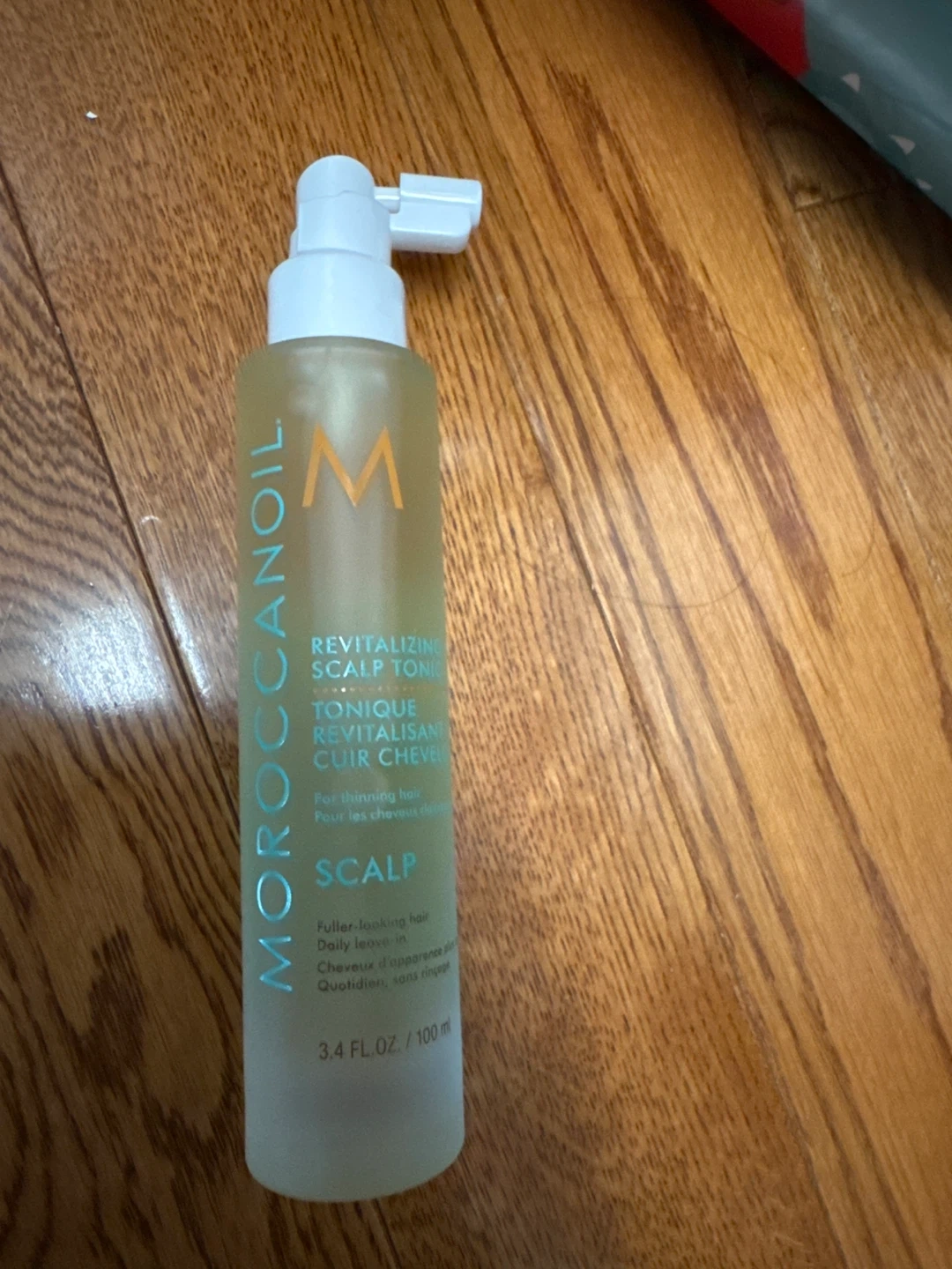 I'm selling a bottle of Moroccanoil Revitalizing Scalp Tonic. It's a daily leave-in treatment designed for thinning hair. The bottle contains 3.4 fl oz / 100ml. It helps to create fuller-looking hair!