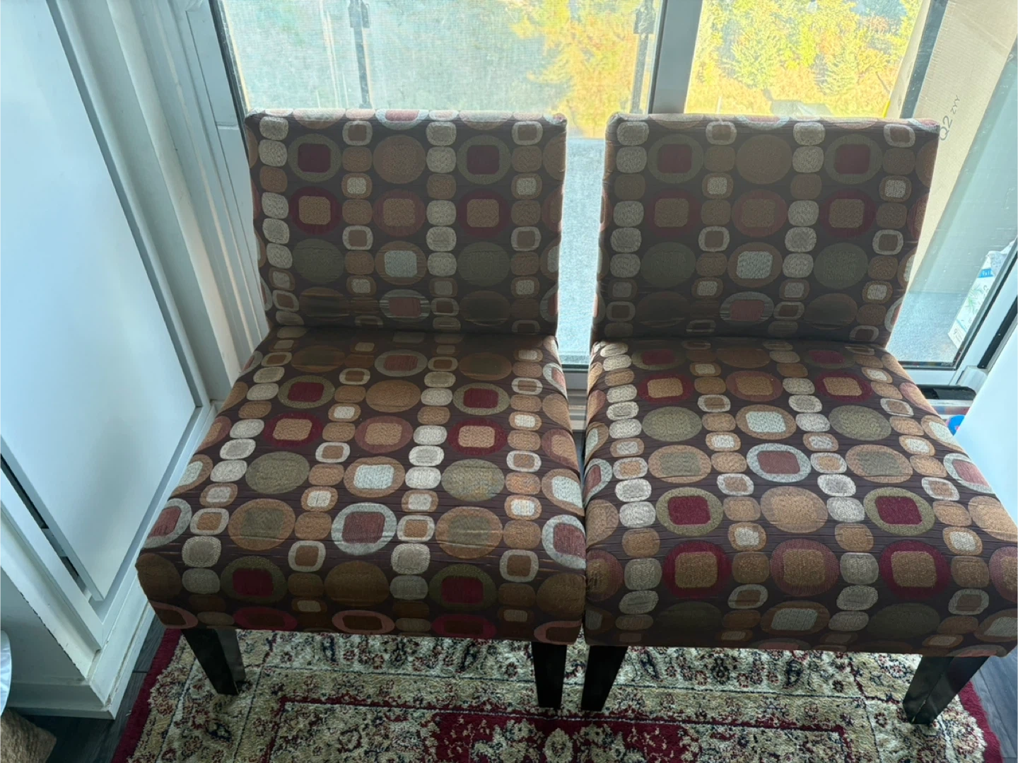 Selling a set of two chairs with a unique patterned design! These chairs are in goof condition and would be a stylish addition to any home space. The material is 100% polyester fibre.
