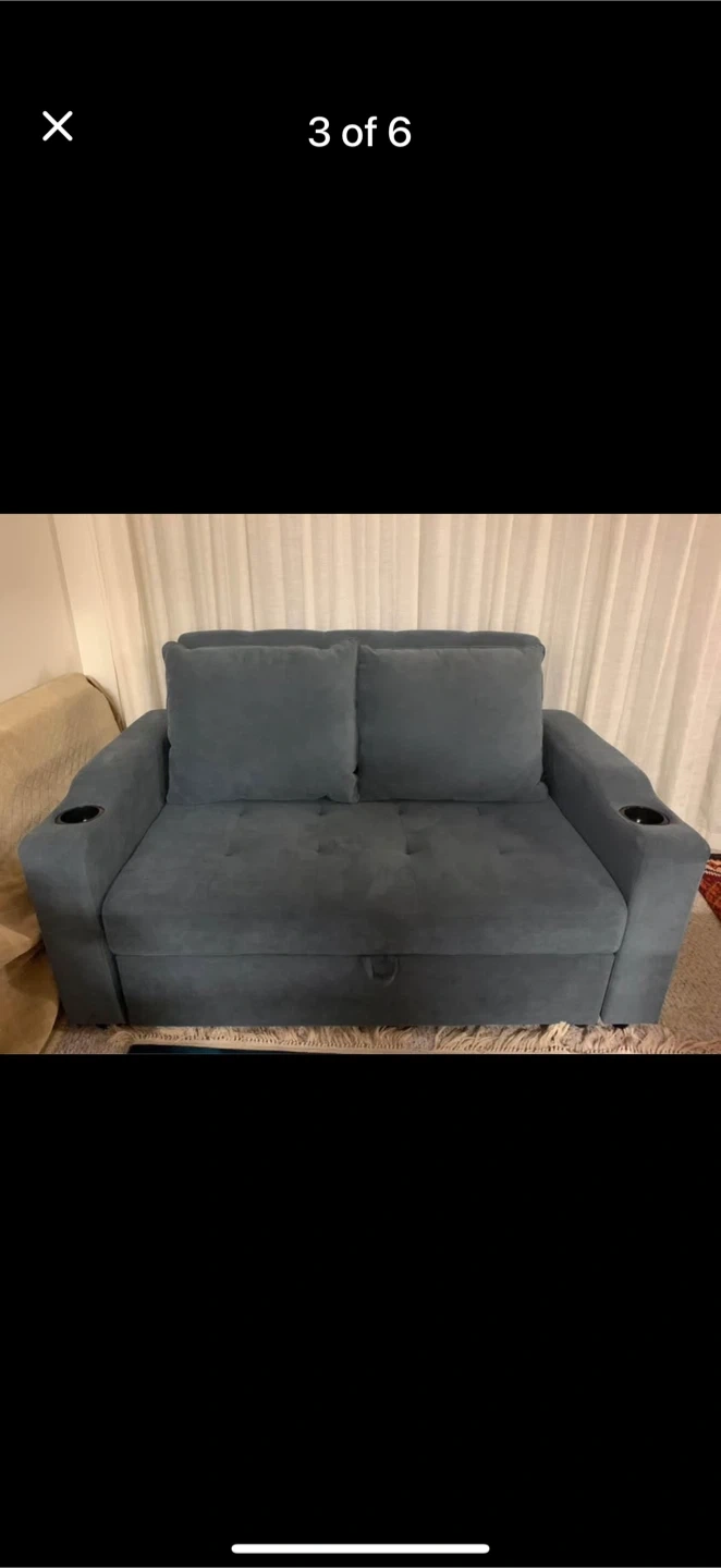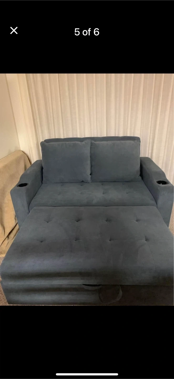 Selling a loveseat that easily converts into a pull-out bed! It's in great shape and features convenient cupholders on each arm. Perfect for small spaces or a guest room