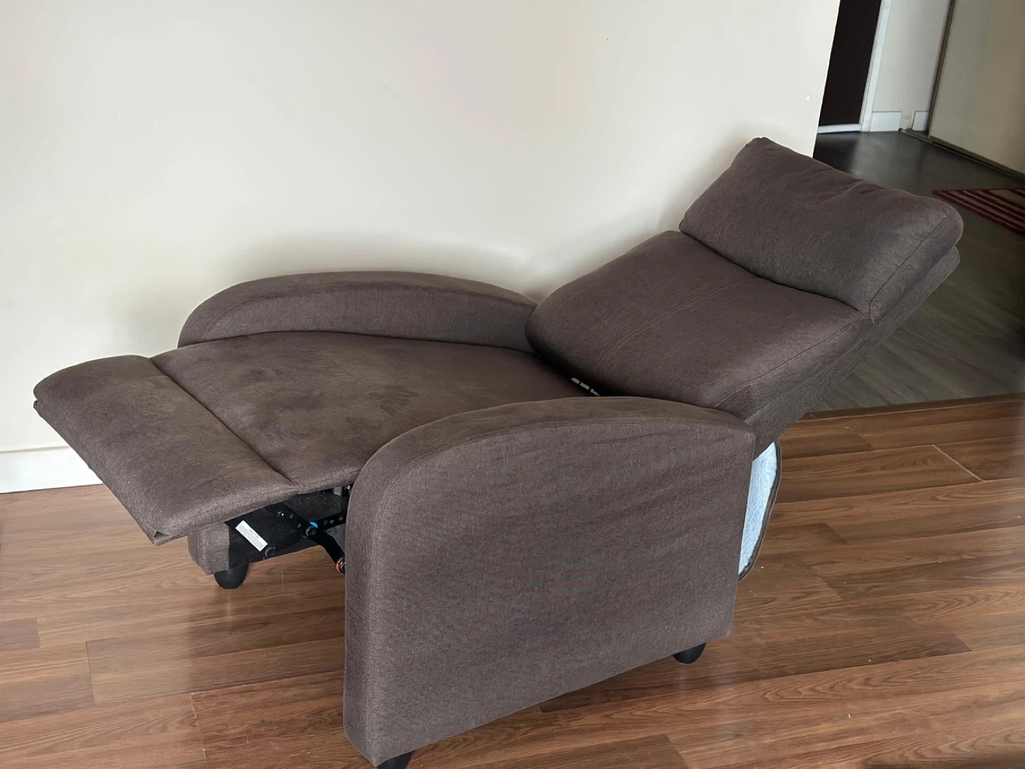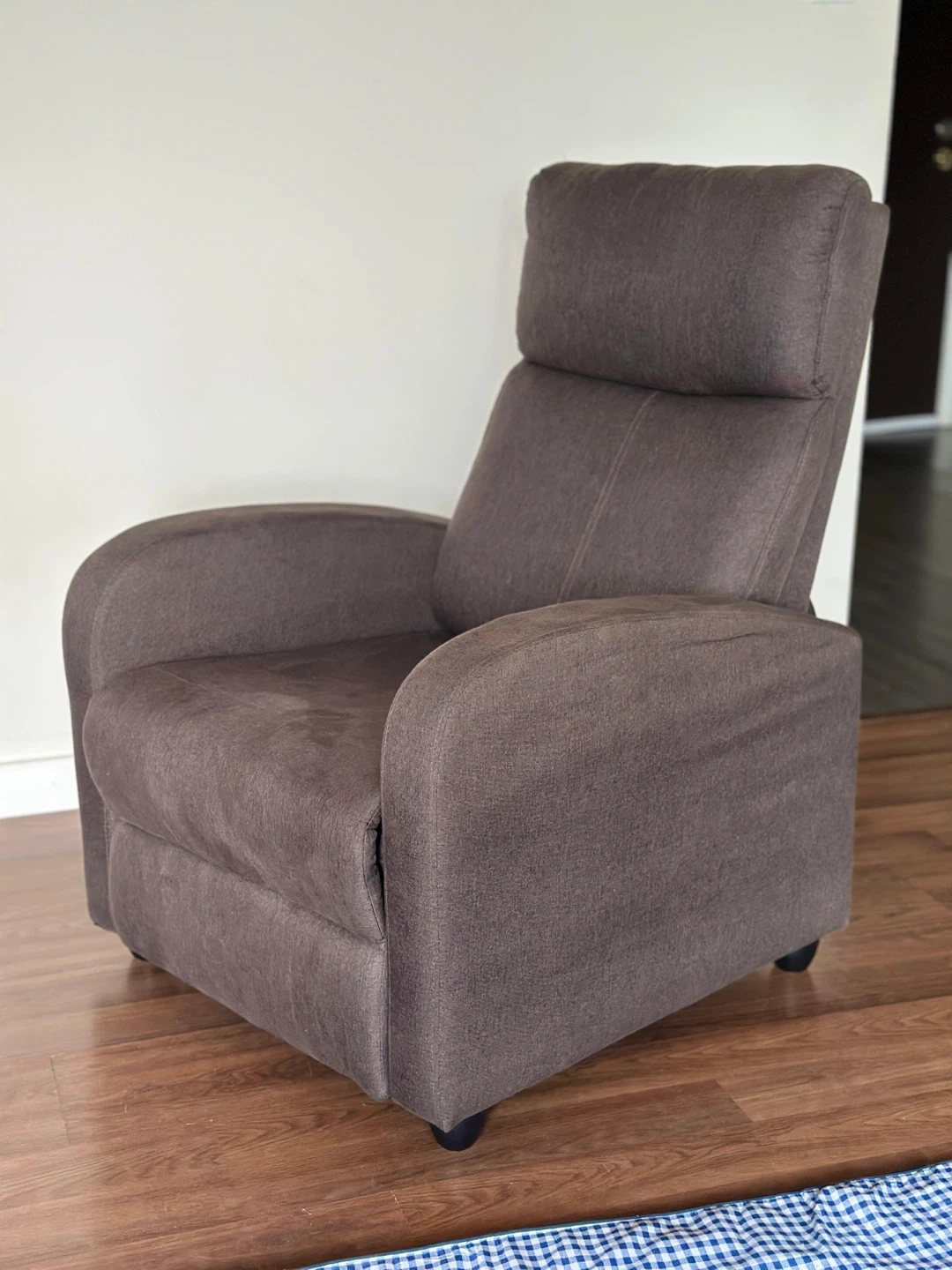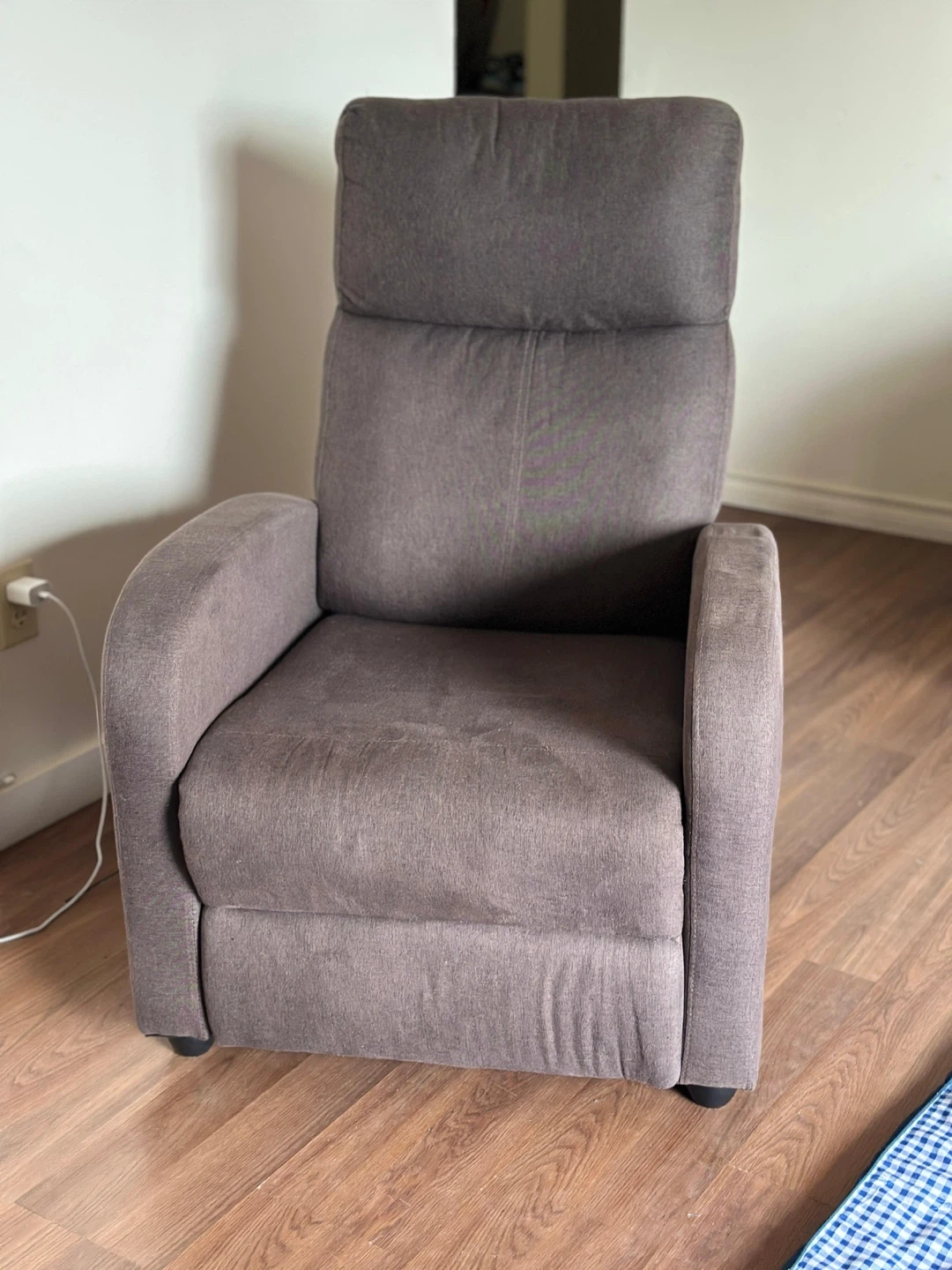 Selling a comfy brown recliner chair! It's in great shape and perfect for relaxing after a long day. The fabric is soft and cozy, and the reclining function works smoothly. It would be a great addition to any living room or den