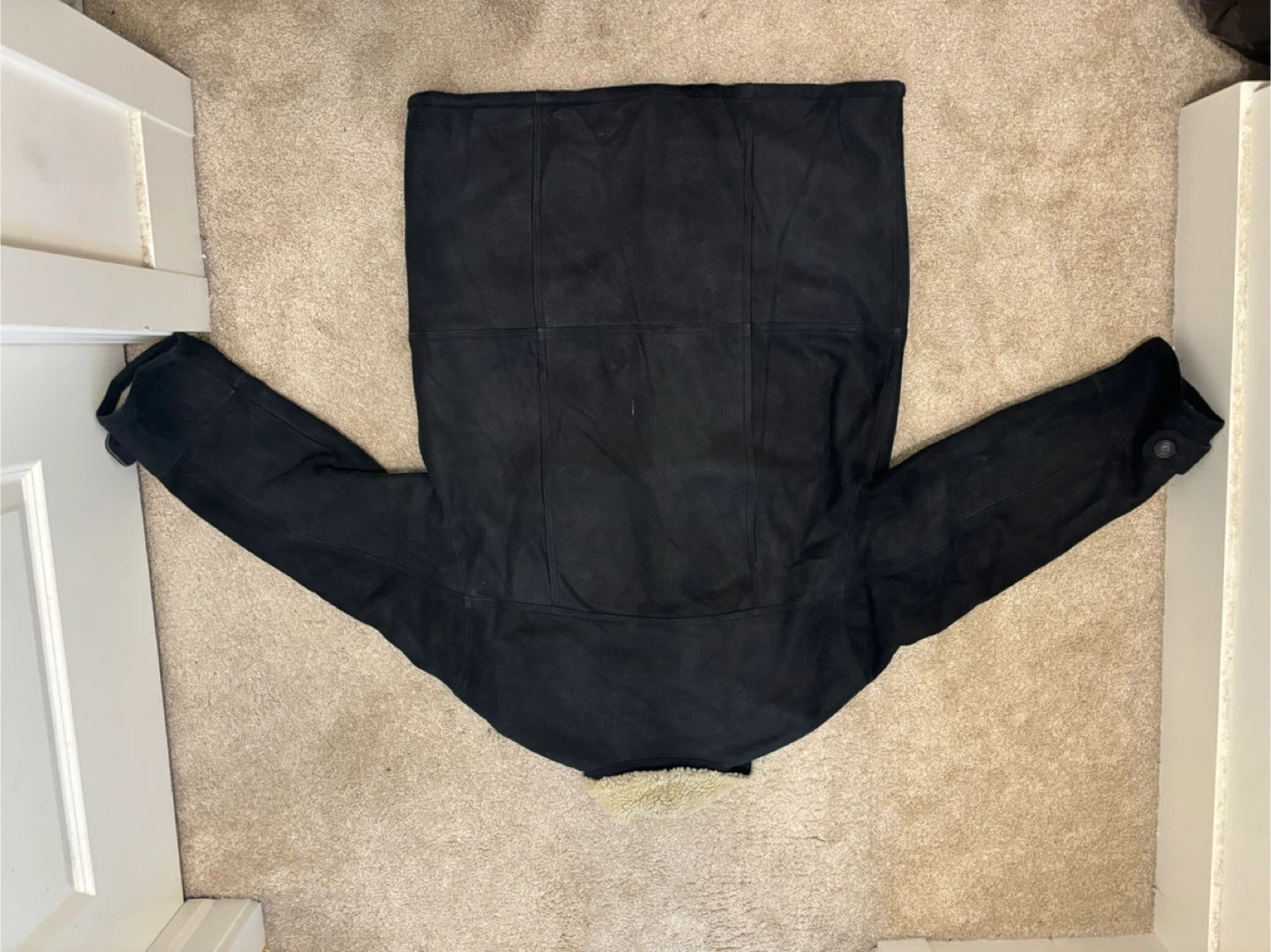 Selling a black suede coat with a cozy shearling lining! It's in good condition and perfect for staying warm during the colder months. The coat features a button closure and stylish design.