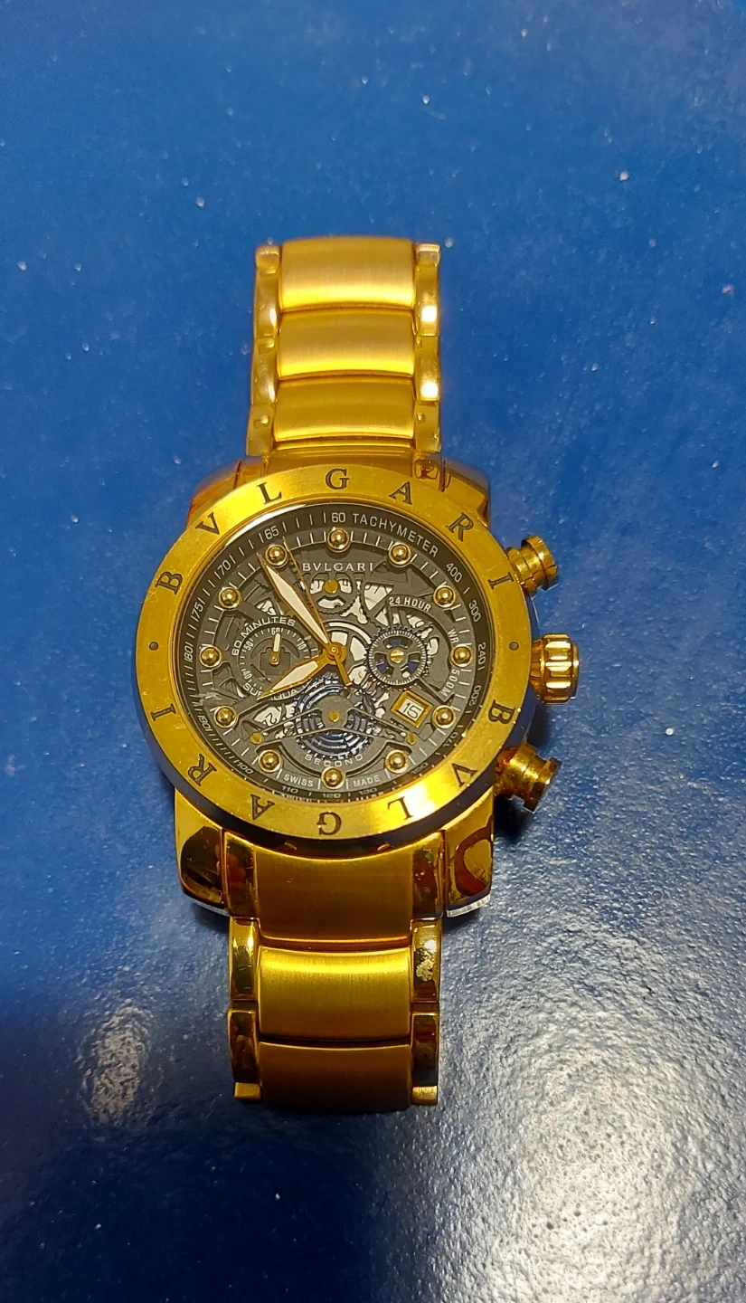 Selling a BVLGARI wristwatch in gold. It's a striking timepiece with a unique design on the back, featuring the words 'NUCLEAR WEAPON' and 'MADE IN SWISS'. A rare find for watch collectors!