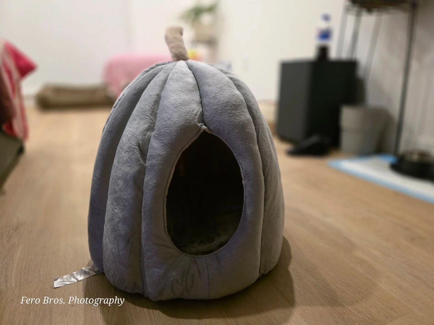 Super cute grey pumpkin pet bed, perfect for cats or small dogs! It's in great shape and ready for a new furry friend to call it home.