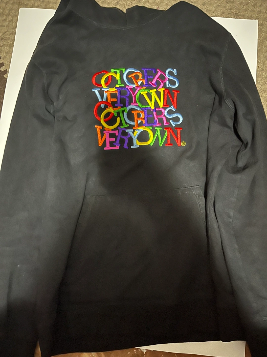 Selling a gently used October's Very Own (OVO) hoodie in black. Features the classic OVO logo embroidered in colourful lettering on the front.