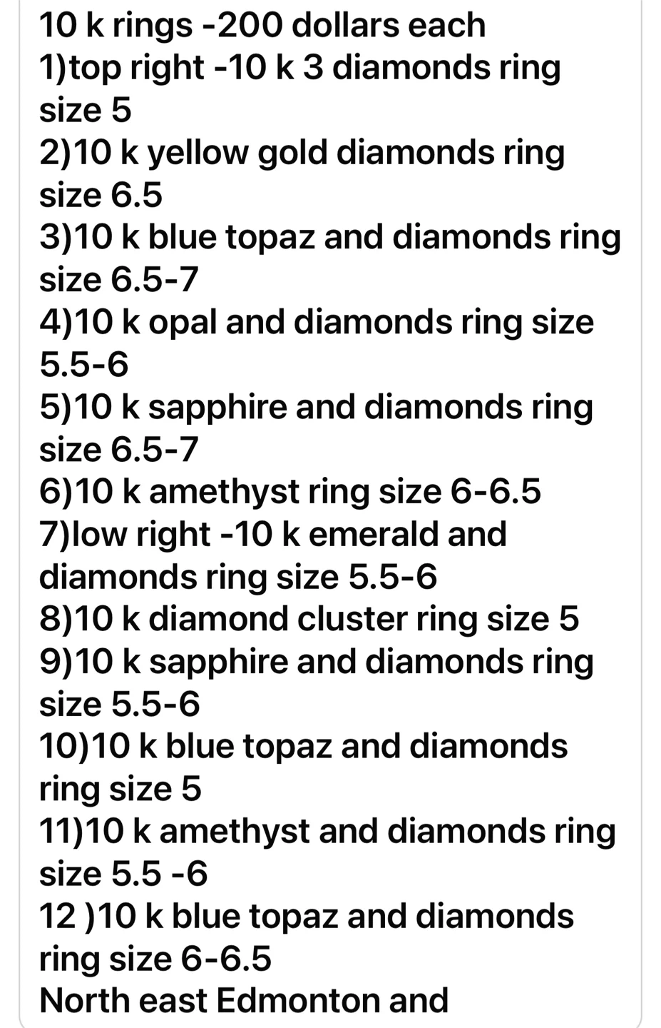 Selling a collection of 10k gold rings featuring various gemstones and diamond accents. The rings come in different sizes, ranging from 5 to 7.