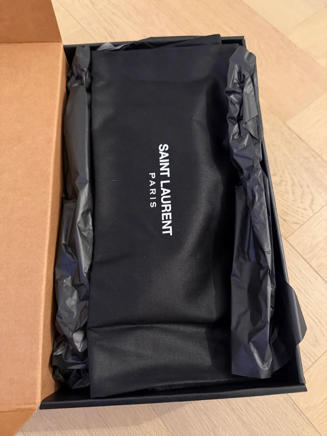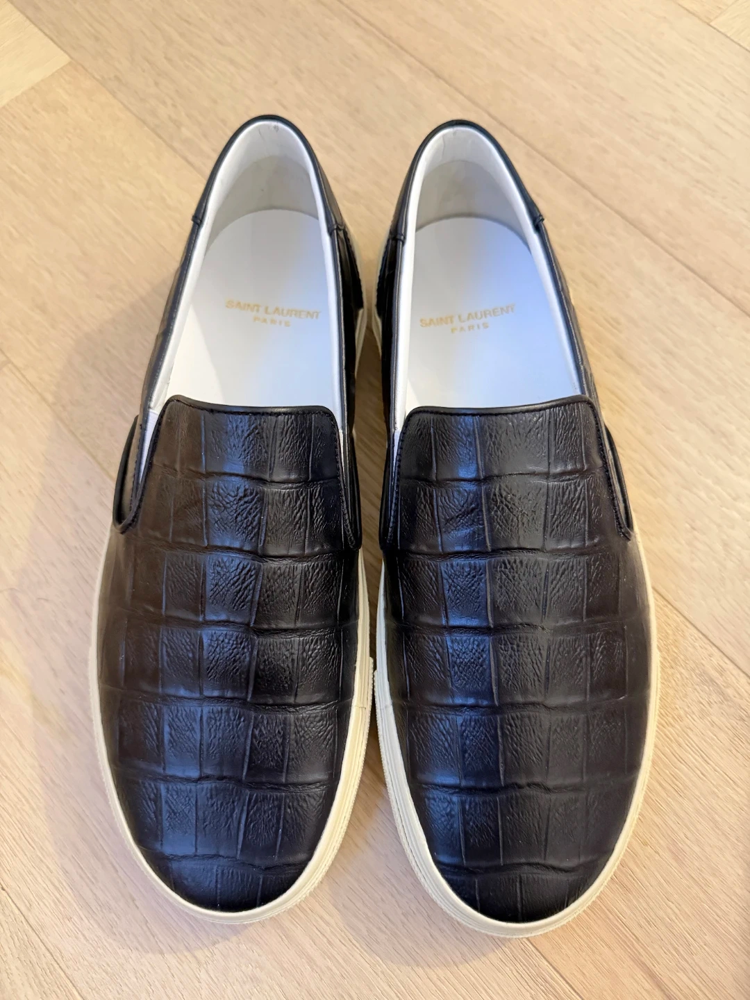 Selling a pair of Saint Laurent slip-on sneakers in black leather. They have a cool, textured look and a comfy design. Comes with the original box!