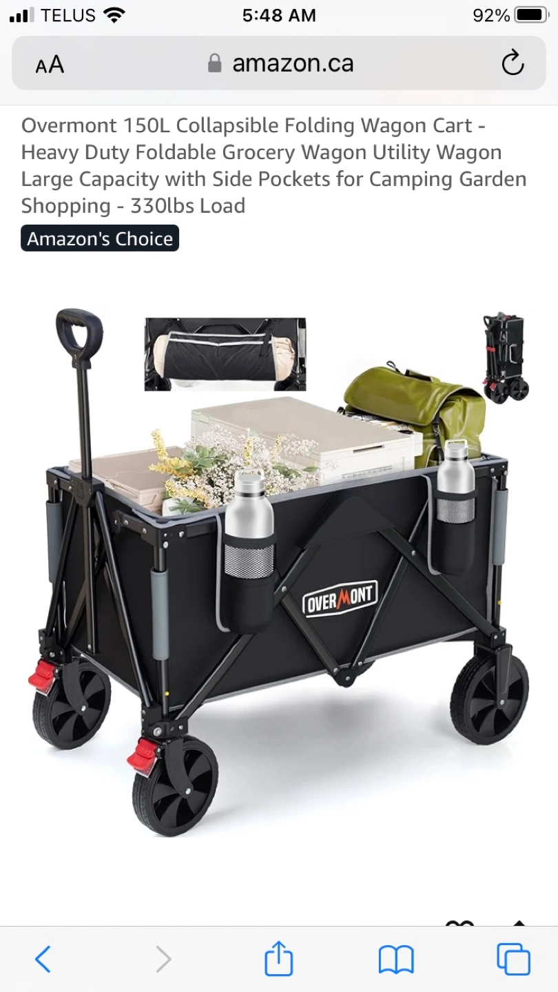 Selling an Overmont 150L Collapsible Folding Wagon Cart. It's a heavy-duty foldable grocery wagon utility wagon with a large capacity and side pockets. Great for camping, gardening, and shopping! It can handle up to 330lbs of load