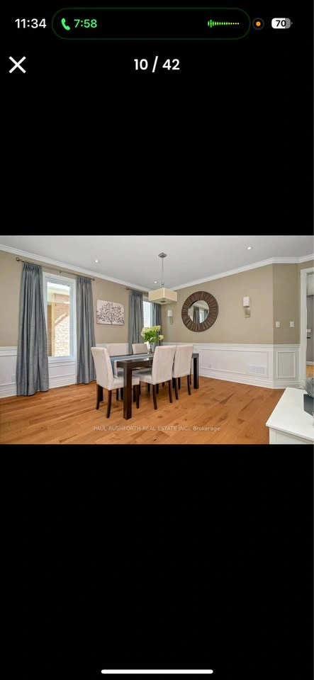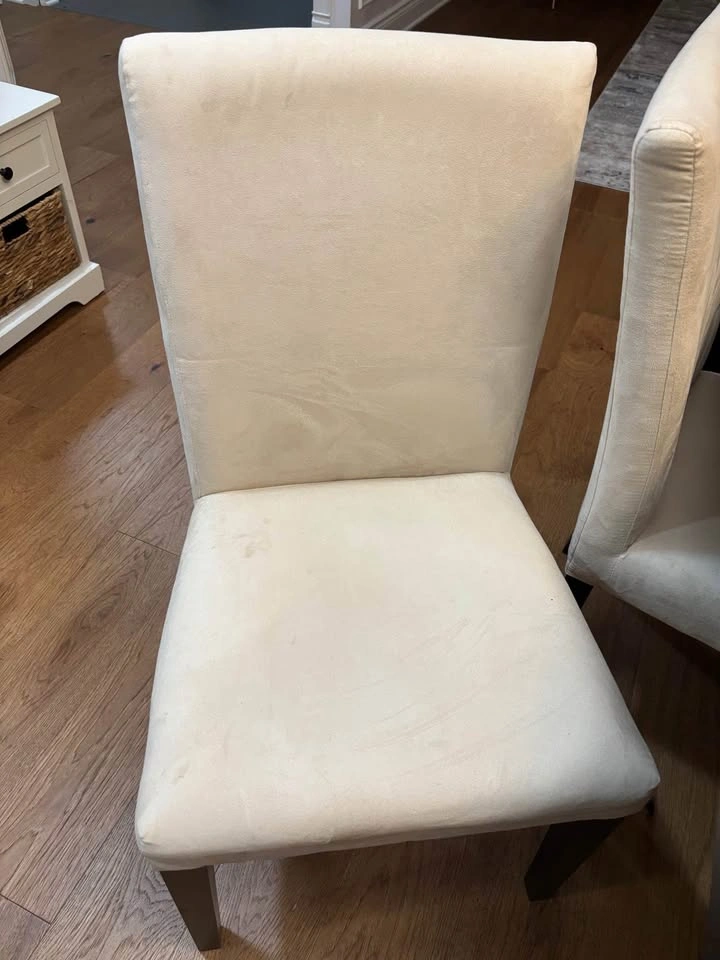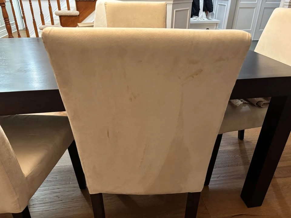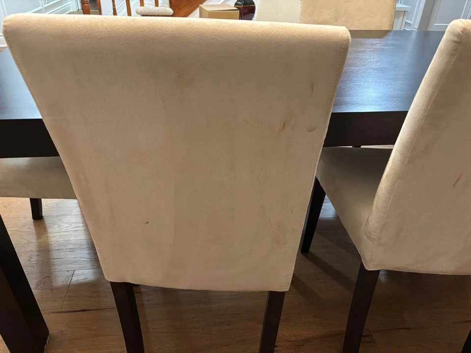 Beautiful dark wood dining room table with 6 microsuede parsons chairs. Originally purchased at high end furniture store called Up Country. Chairs have some minor spots on them from over the years but solid construction.