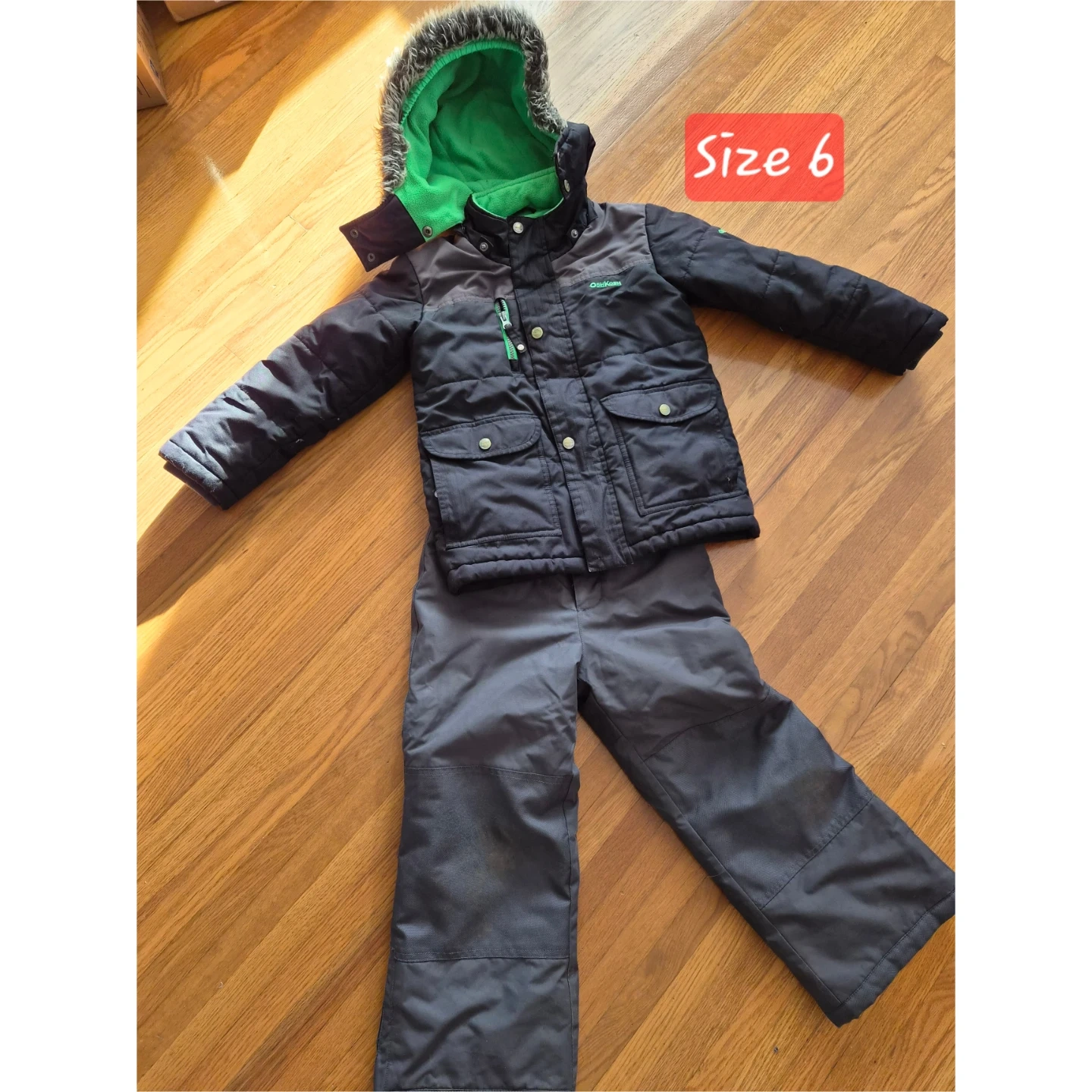 Selling a gently used OshKosh snowsuit in size 6. It's a black jacket with grey pants, perfect for keeping your little one warm during the winter months! The jacket has a green lining in the hood and a faux fur trim.