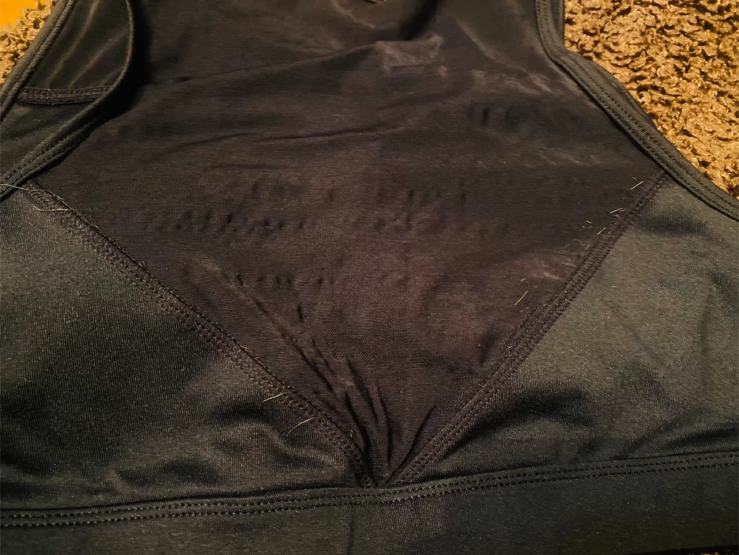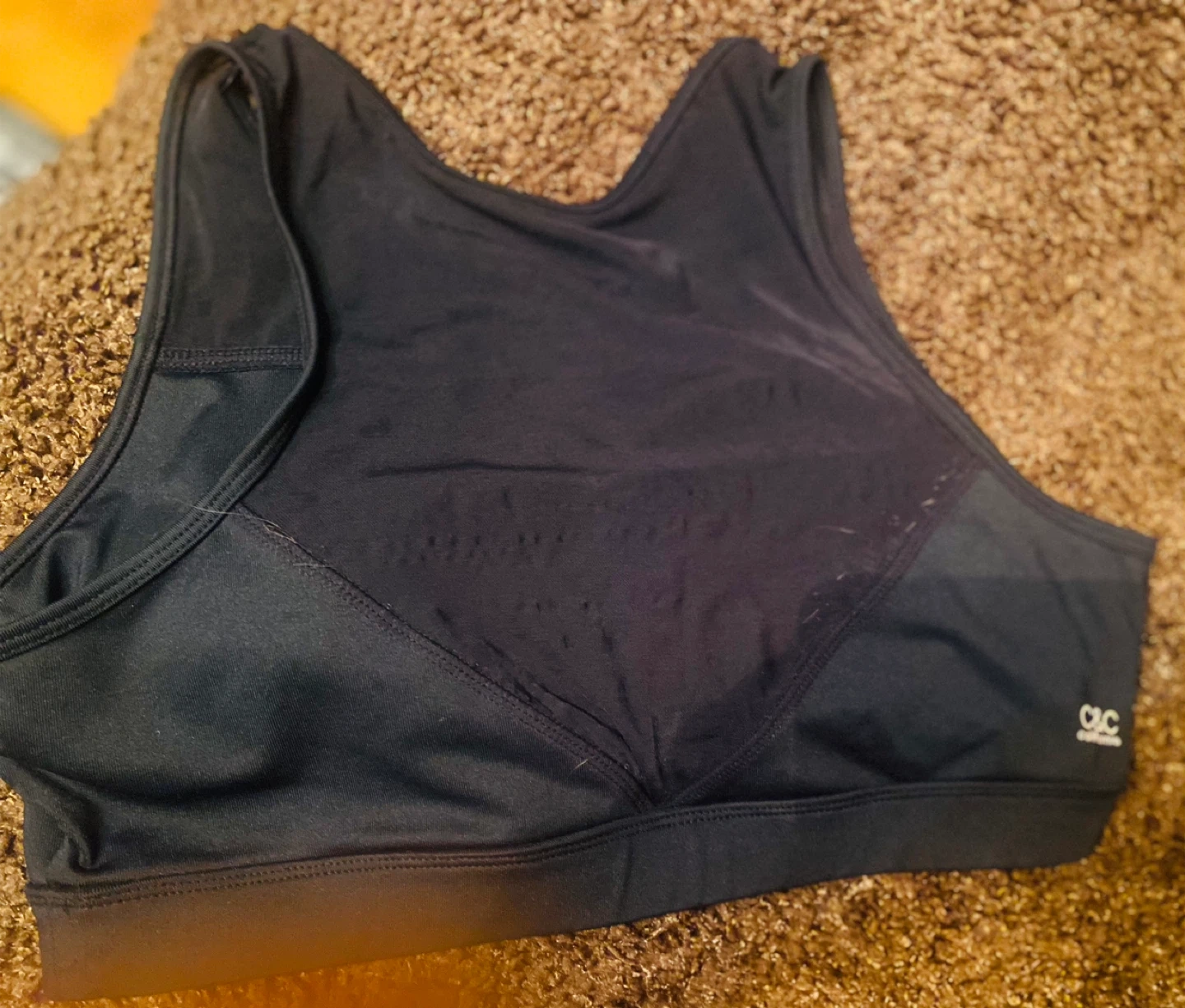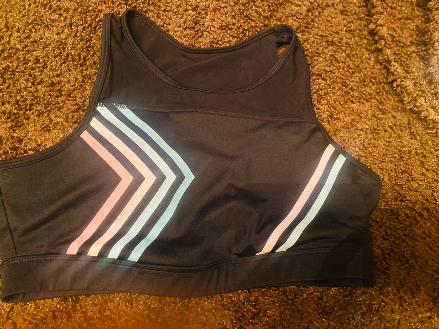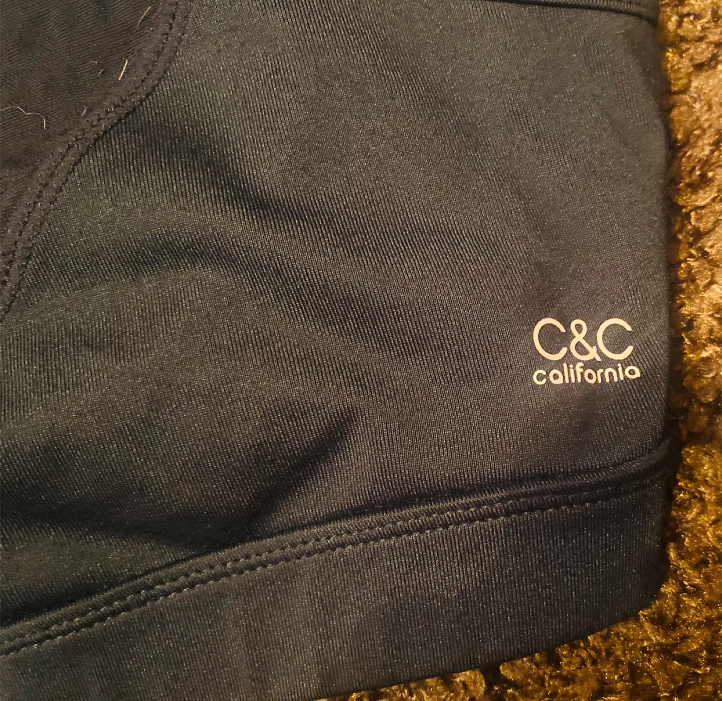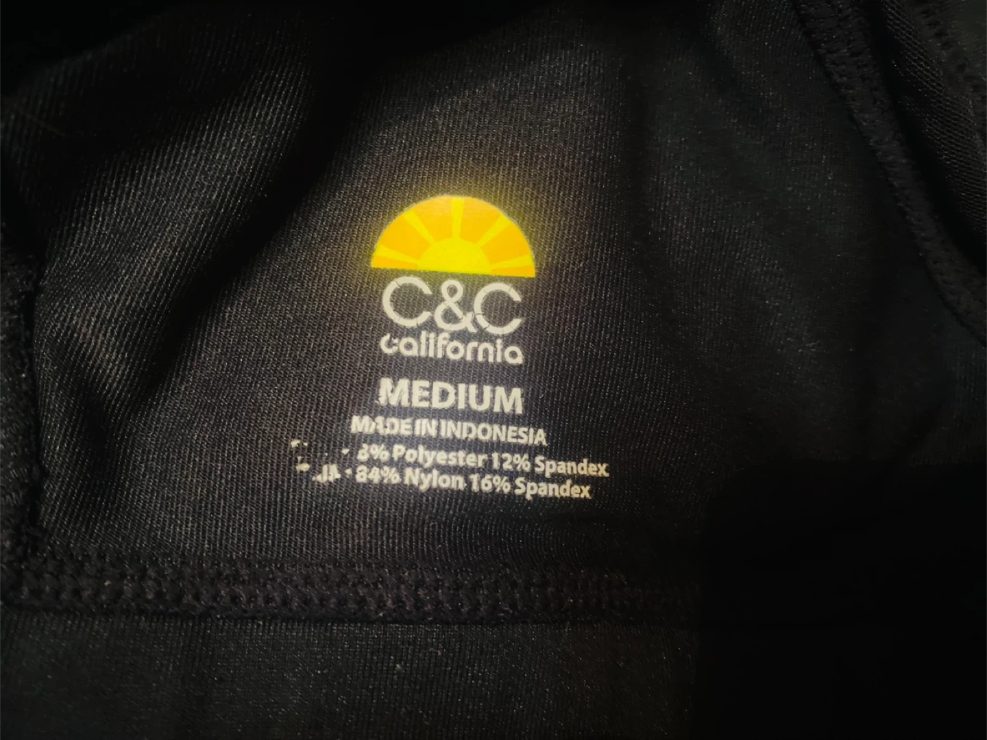 Selling a C&C California sports bra in size medium. It's black with a cute striped design. The material is a blend of 84% nylon and 16% spandex, with some polyester too!