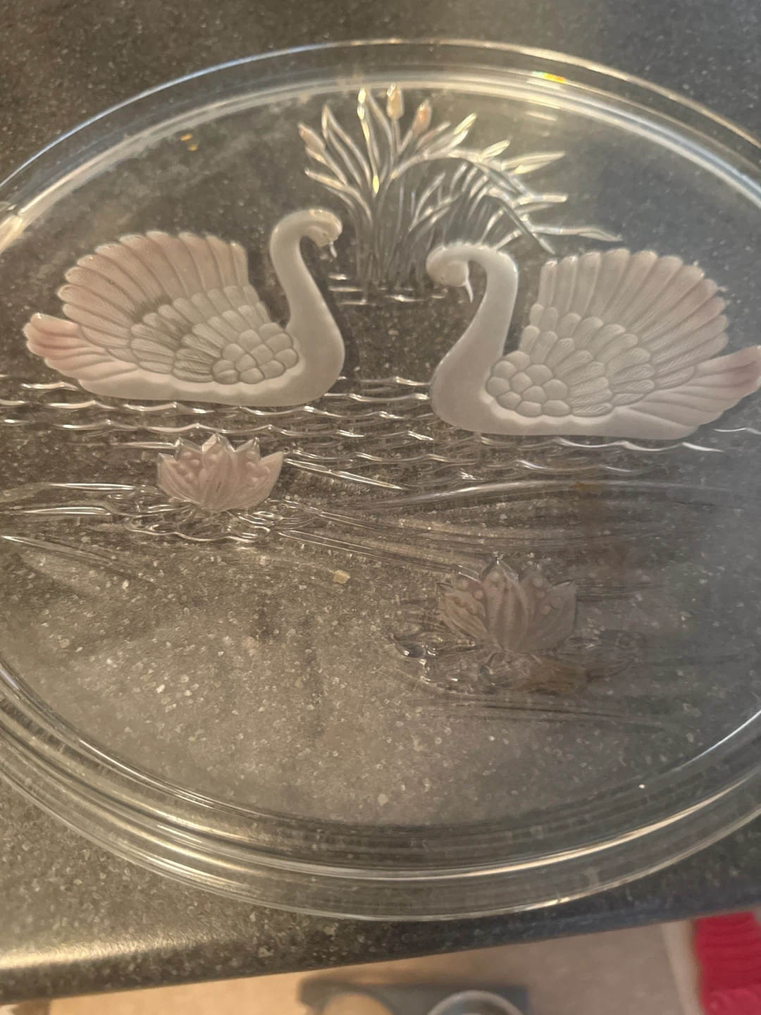 113Selling a lovely glass plate with a swan design. It's in great condition and would look beautiful on display or used for serving