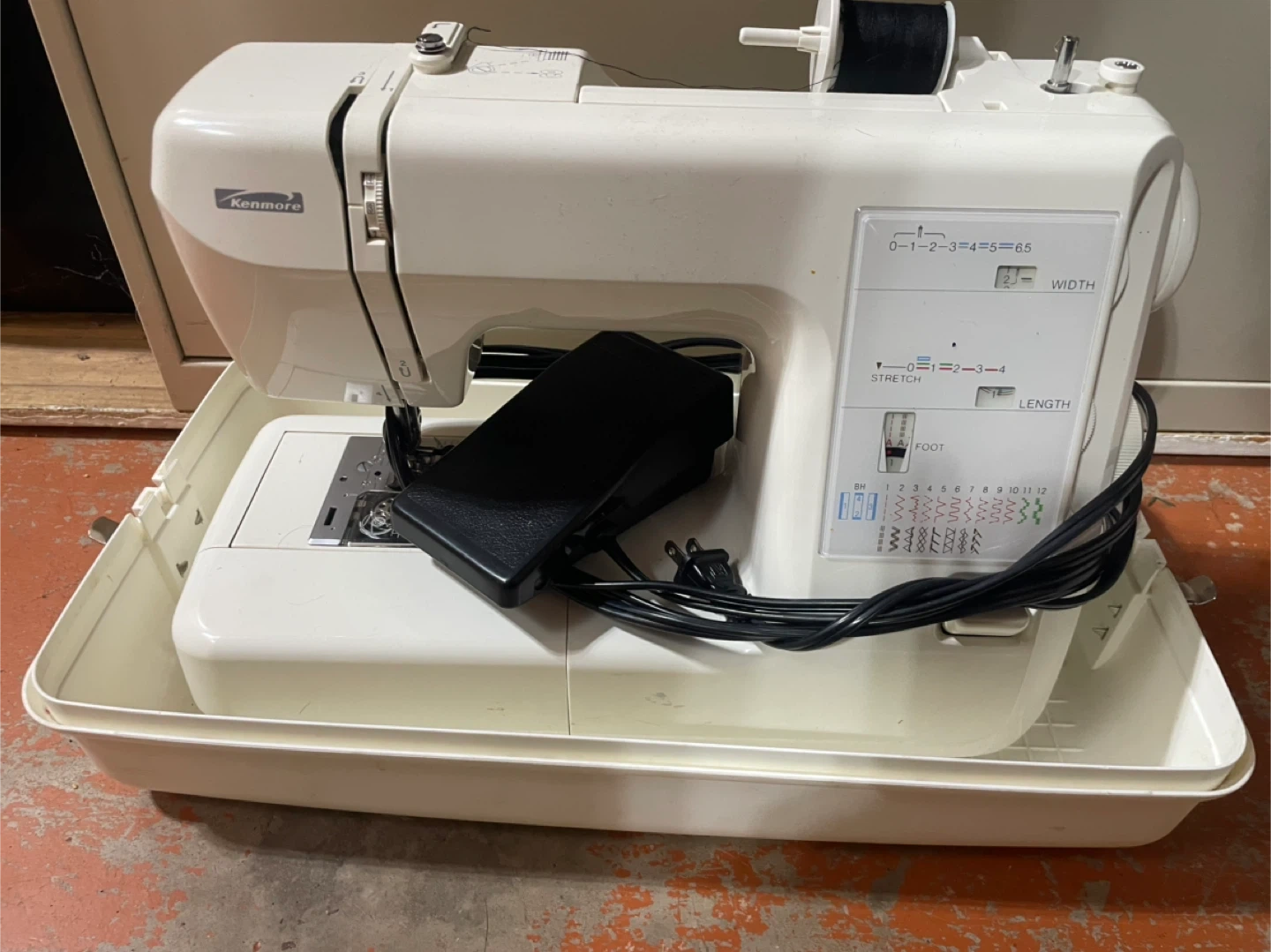 Selling a Kenmore sewing machine. It comes with a foot pedal, and the machine has adjustable width and length settings for different stitch types. Perfect for all your sewing needs! Includes carrying case