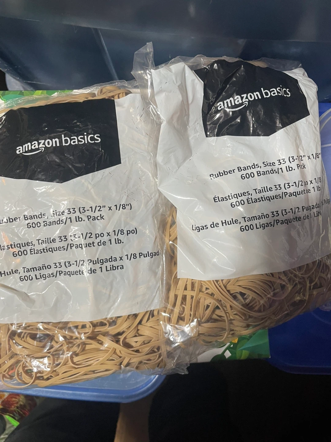 Selling a pack of Amazon Basics Rubber Bands, Size 33 (3-1/2" x 1/8"). Each pack contains 600 bands and weighs 1 lb