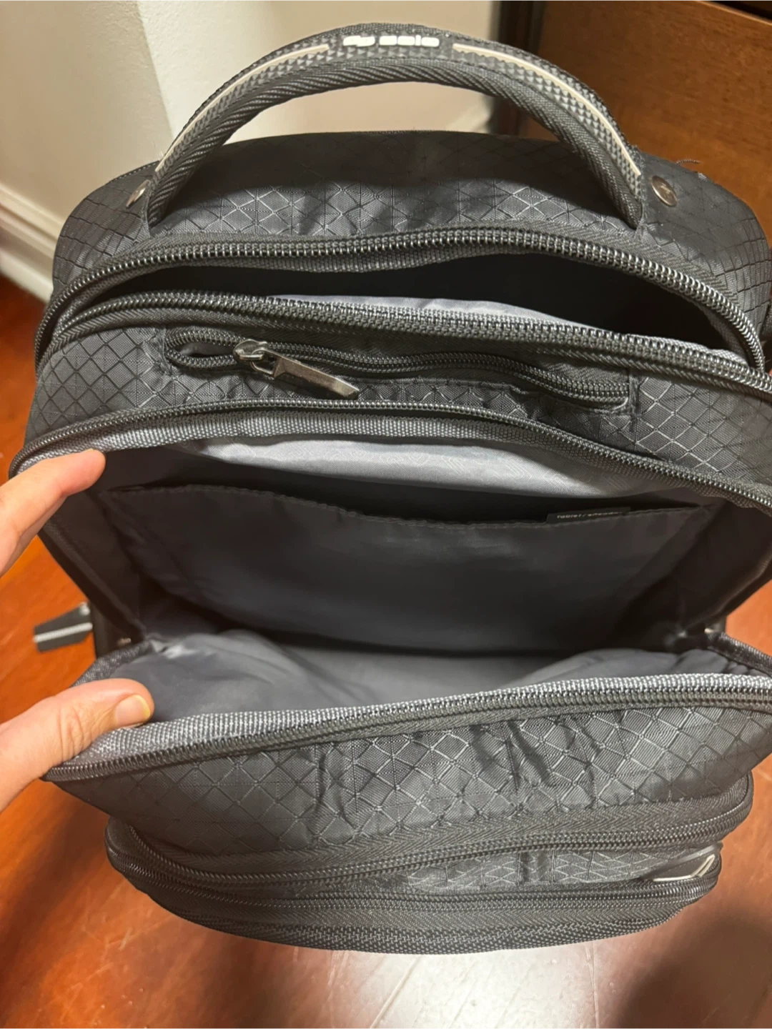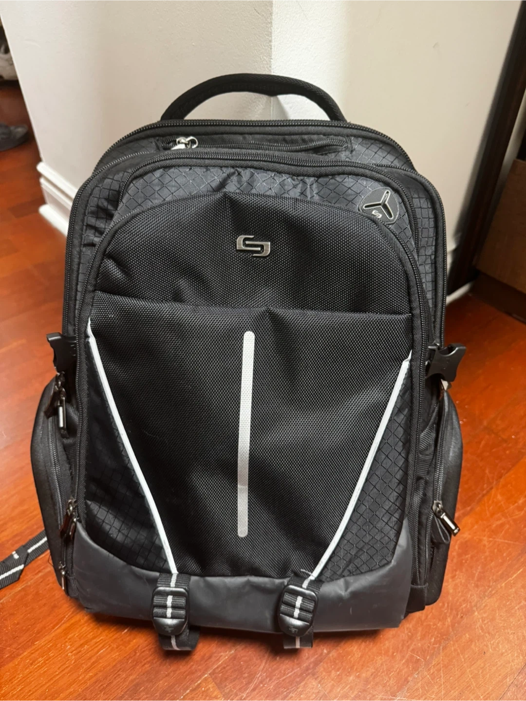 616SOLO backpack, perfect for carrying your laptop and other essentials, and it's in good condition. The backpack features multiple compartments and a sleek design. Features: * Multiple compartments for organized storage * Padded laptop sleeve * Comfortable shoulder straps $25 Yonge and finch area