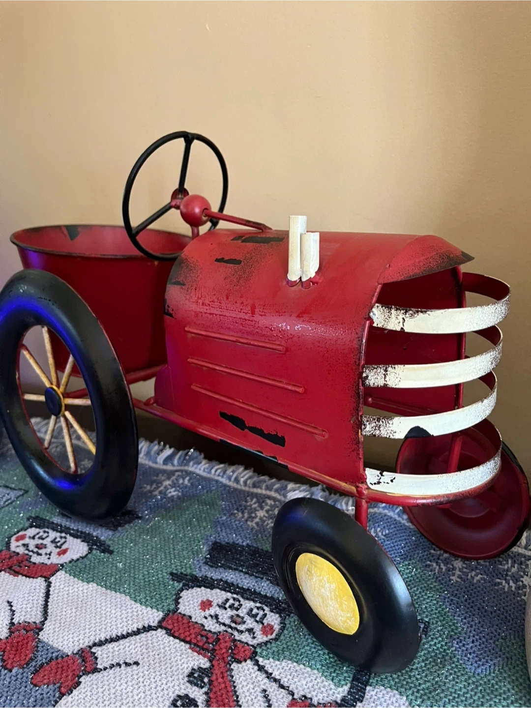 Selling a charming red metal decorative tractor planter!It's a unique piece that would look great in any room or collection. It has a rustic, slightly distressed look, adding to its vintage appeal