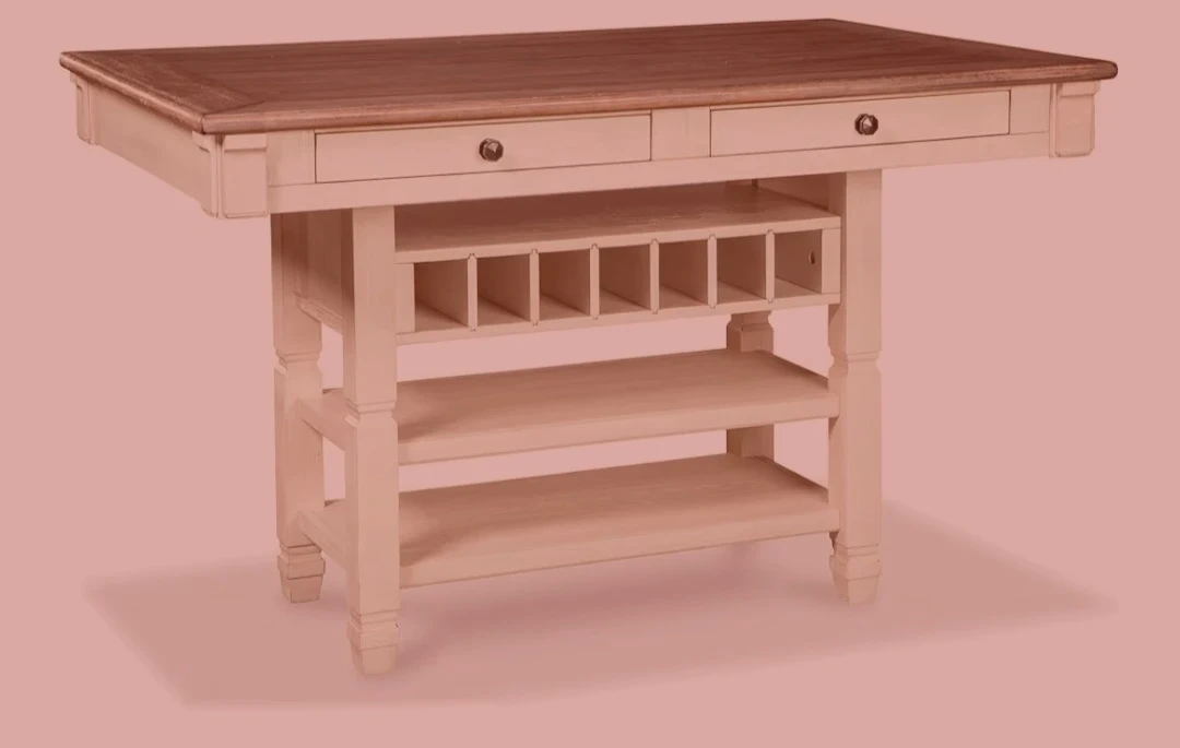 This kitchen island or counter height table is perfect for adding extra counter space and storage to your kitchen. It features a beautiful solid driftwood grey wooden top, and two shelves for storing dishes or other kitchen essentials. It's in great condition and ready for a new home! Can also be used for a game room. The wood is white distressed wood.