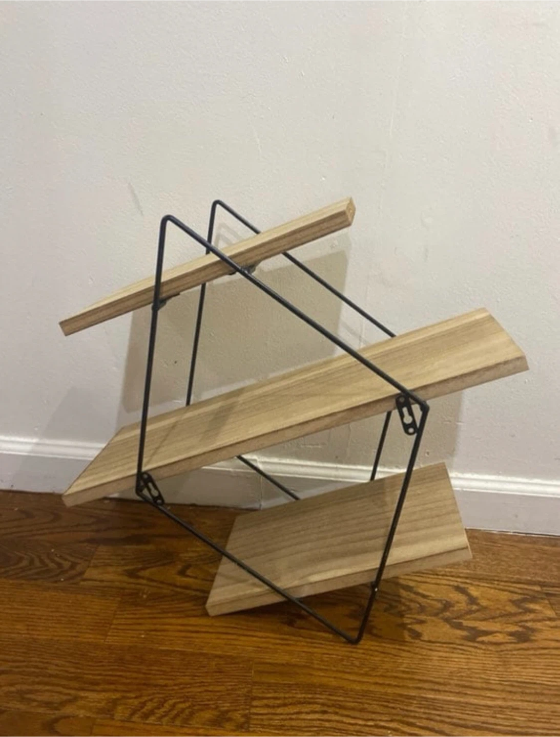 Selling a stylish geometrical wall shelf with a modern design! It features light-colored wooden shelves supported by a black metal frame. Perfect for adding a touch of contemporary flair to any room