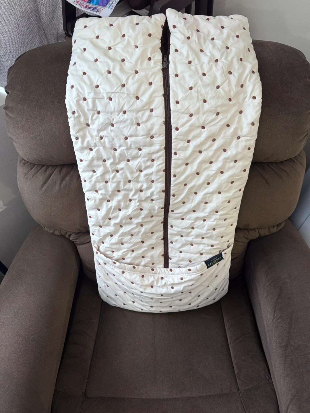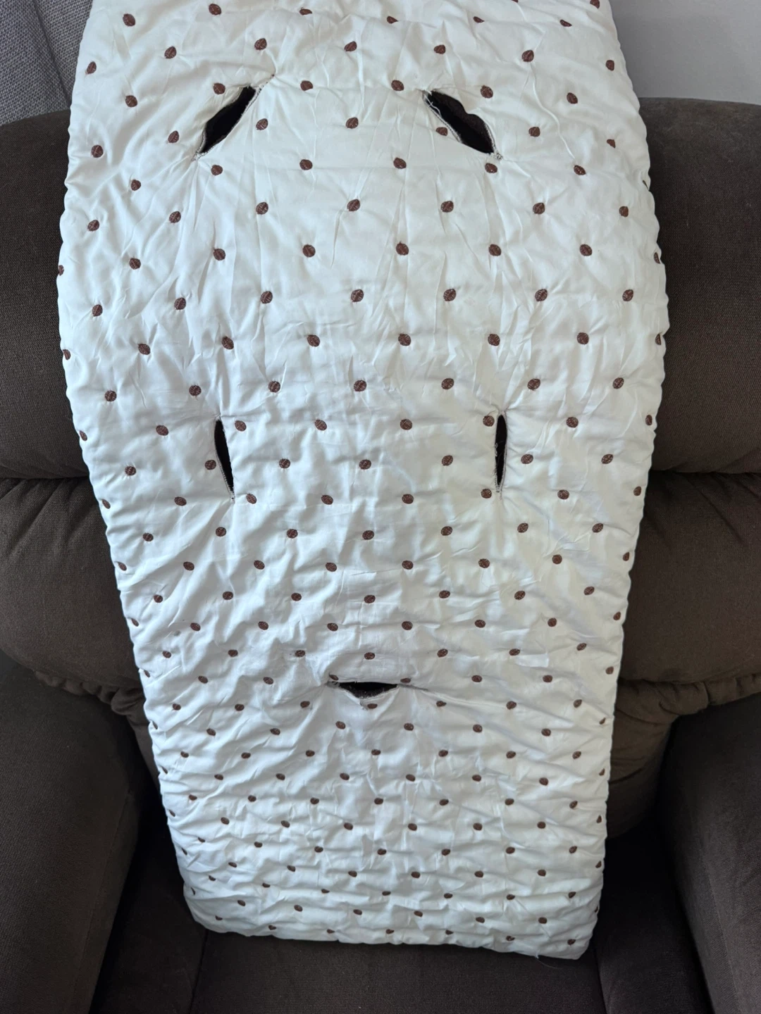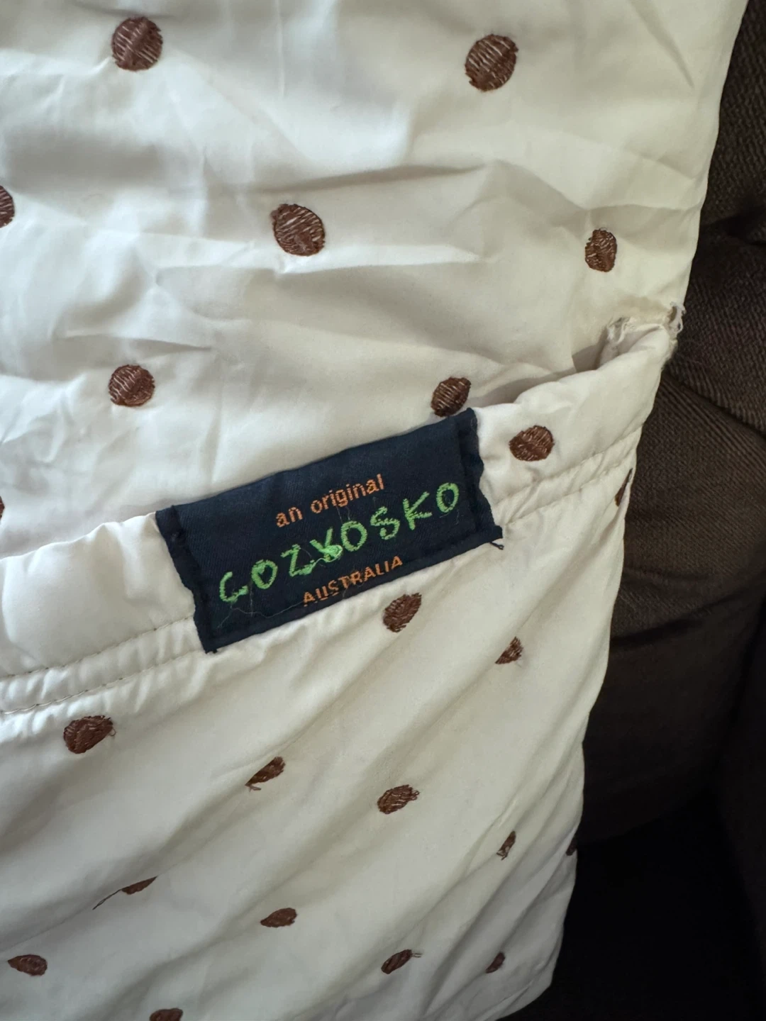 Cozzosko baby buggy bag! It's in great condition and has a cute polka dot pattern on the outside and a soft, plush brown interior. Perfect for keeping your little one warm and cozy!
