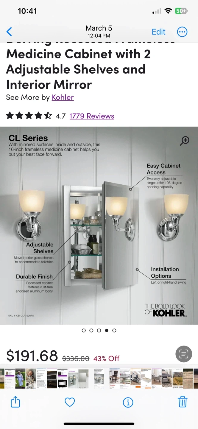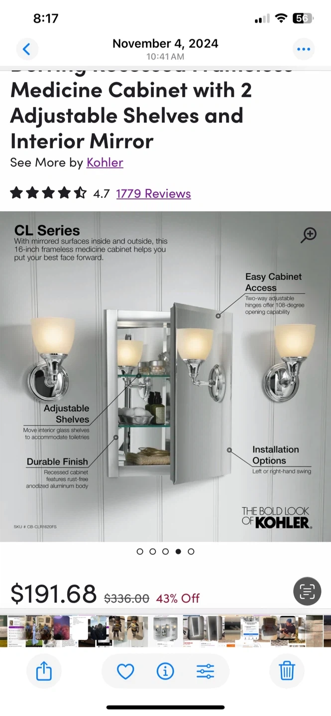 Selling a Kohler medicine cabinet with two adjustable shelves and an interior mirror. It's a recessed cabinet with a durable finish, featuring a recessed cabinet and anodized aluminum body. The cabinet has easy cabinet access with hinges that offer 108-degree opening capability. Installation options include left or right-hand swing. Originally for $191.68.