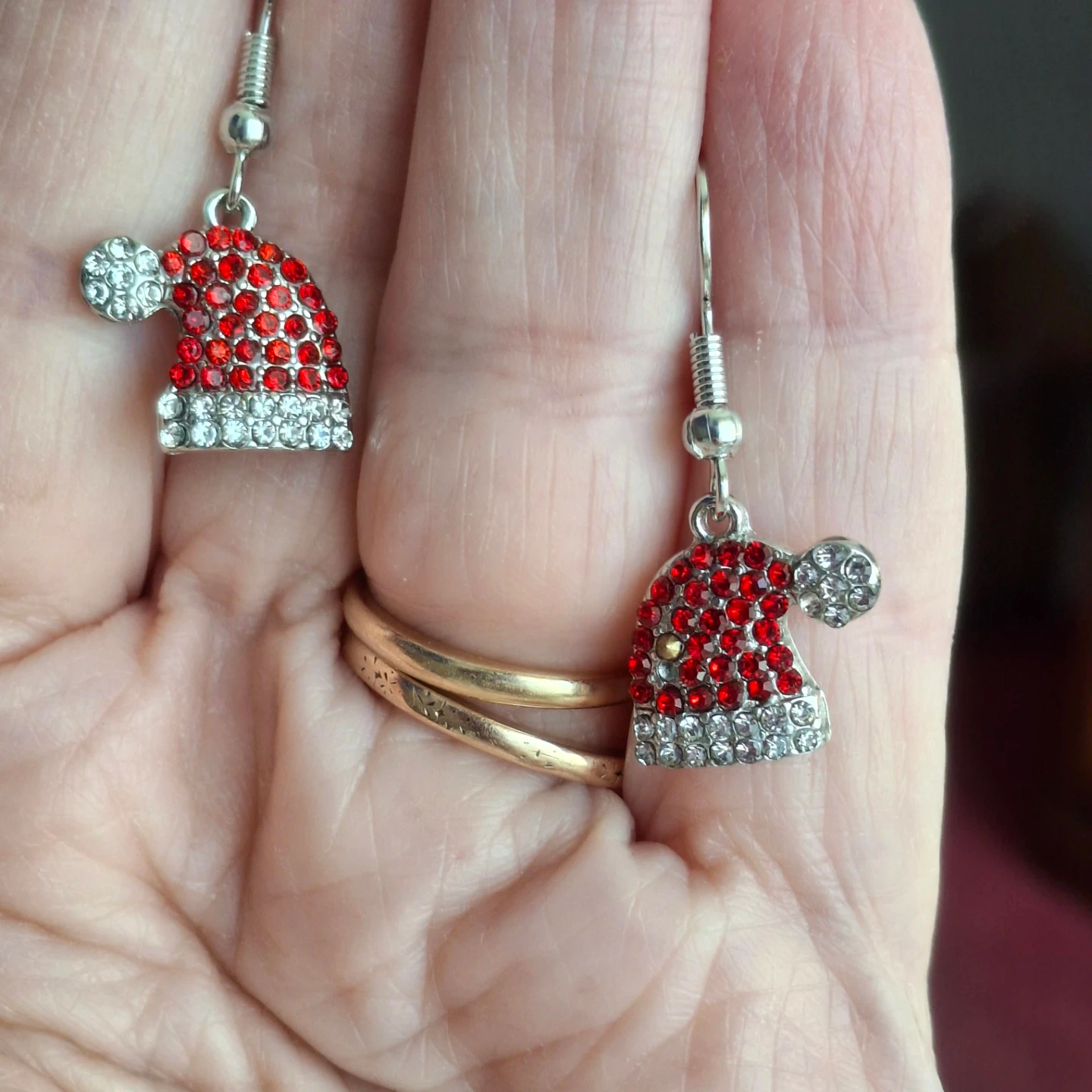401Add a touch of holiday cheer with these adorable Santa hat dangle earrings! They feature a cute design with red and white rhinestones. Perfect for the festive season or a fun Christmas party! They are ready to bring some sparkle to your outfit