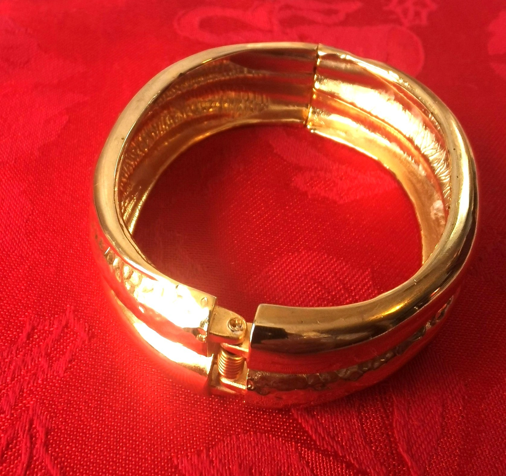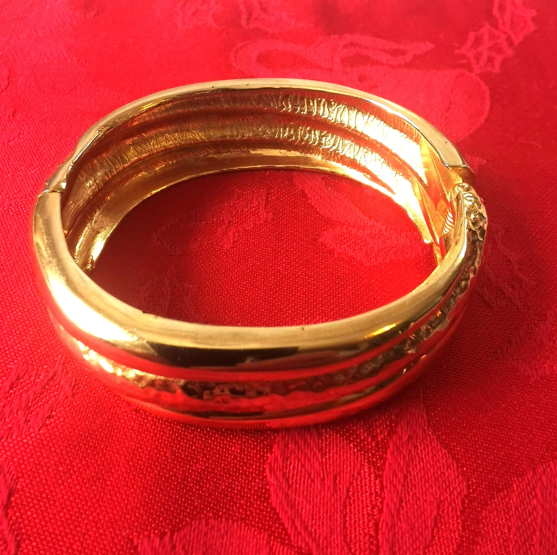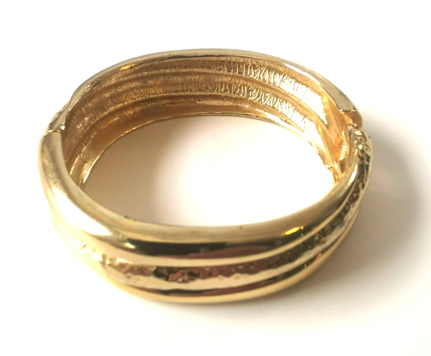 This is a gold tone clamper bracelet with a hinged design medium sized, featuring a wide and bold style that is reminiscent of vintage runway fashion.