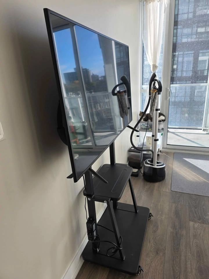 Comes with a sturdy metal rolling stand, adjustable height and cable organizer.