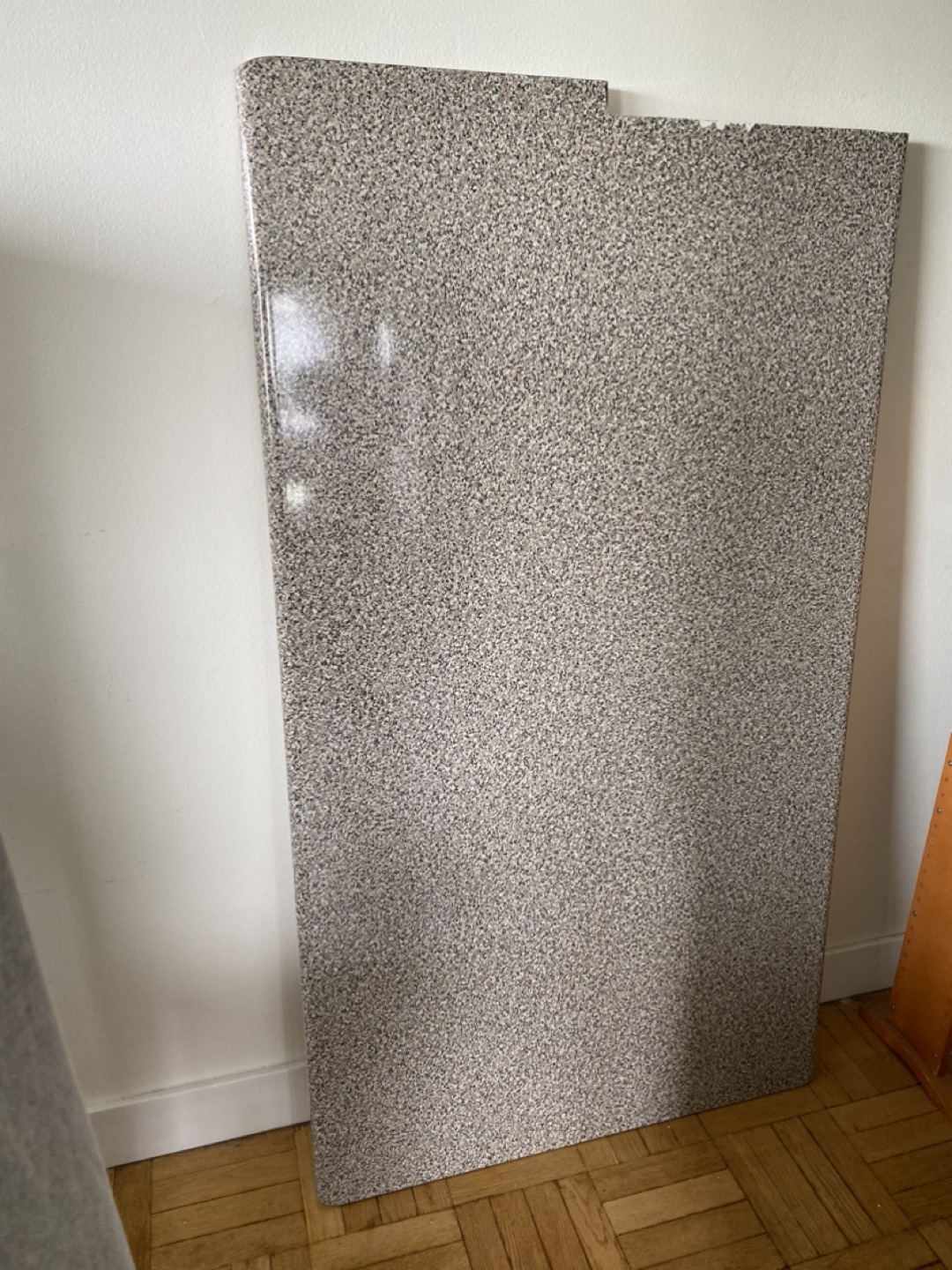 Large piece of grey speckled laminate counter top in good condition. Came from a kitchen island. 5 ft. 4 1/2” long by 3 ft. wide. There is an inch and a half piece out, 18” from the edge (fit around a post). $45 OBO.