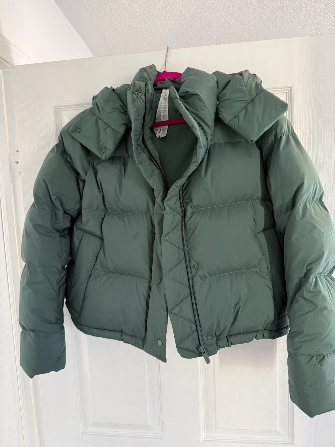 Selling a Lululemon Wunder Puff jacket in size 10! It's a lovely green colour and in great condition. The jacket is made with 100% polyester body and lining, and filled with 80% goose down and 20% feathers. It's designed in Vancouver and made in Bangladesh.
