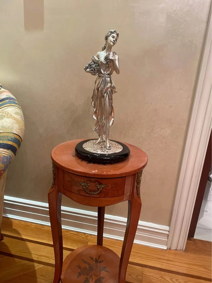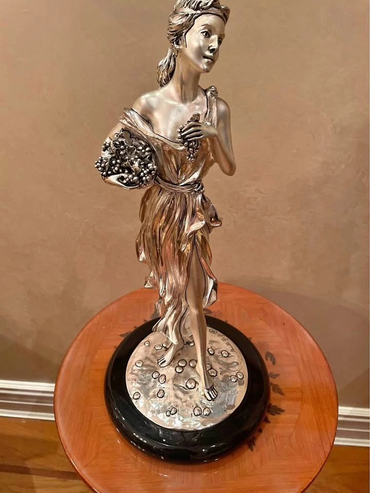 Piece of art Statue made by famous Italian sculptors Marcello gioglia 16.5” tall , base is 8” lacquer wood, it’s signed, made of resin inside with thick layers of silver, it said patina 1000, not sure what is it, it adds beautiful touches to your home and it’s collectible item, bought in jewelry show 20 years ago for over $300