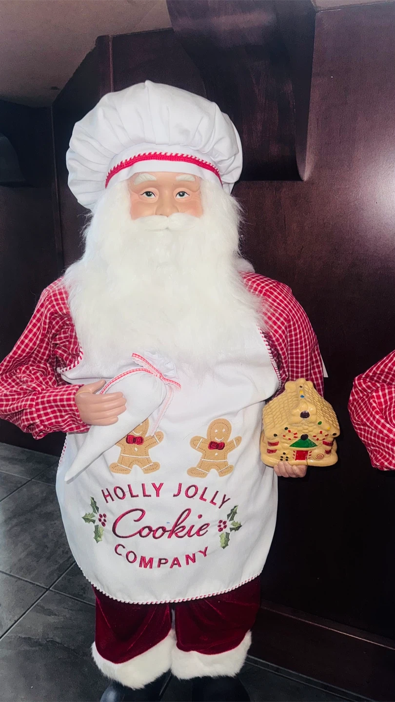 I'm selling a Santa Claus figurine. He is wearing a chef's hat and apron. One has a gingerbread house and the other has a gingerbread man and a lollipop.