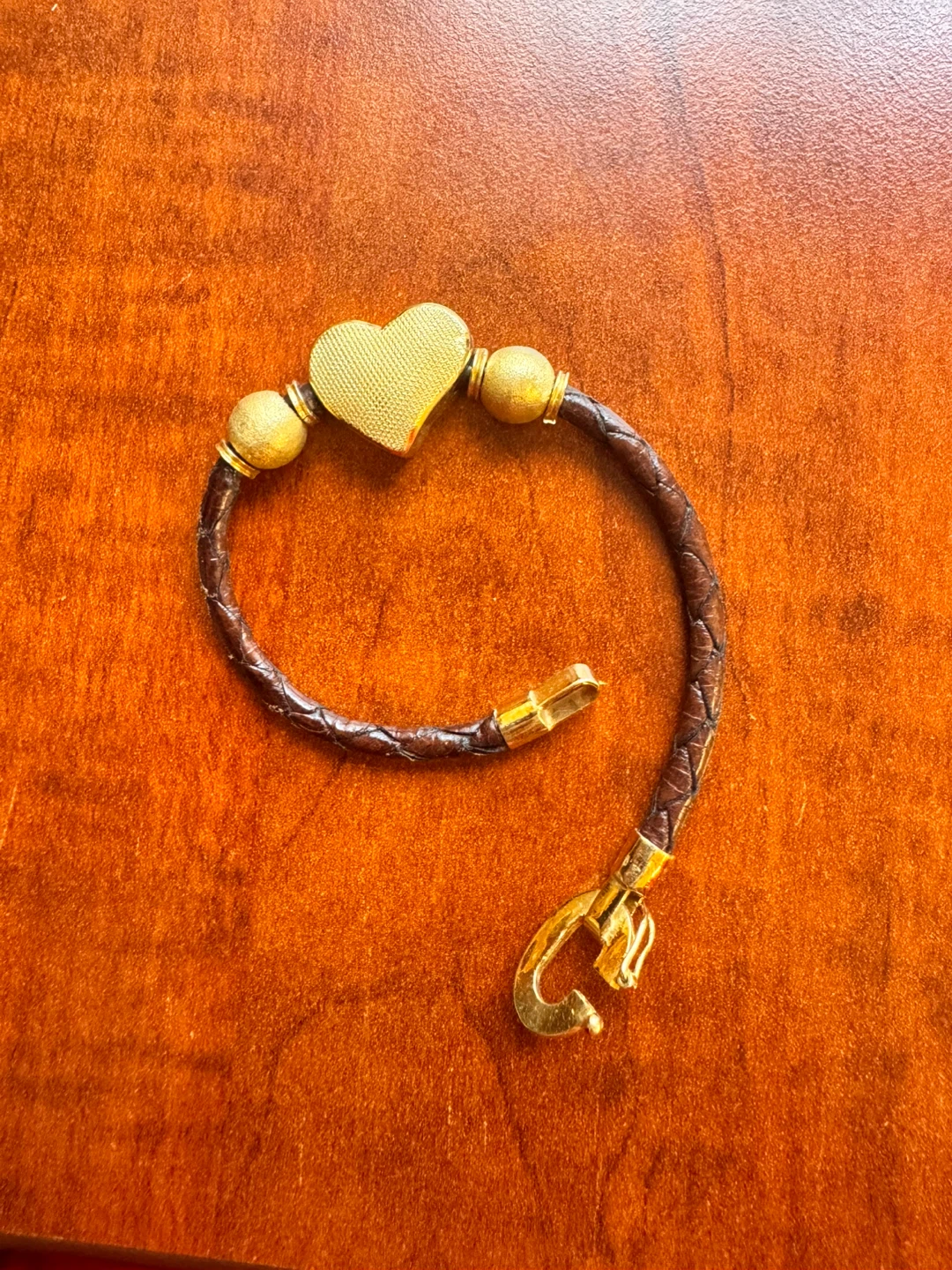 Selling a cute braided leather bracelet with a solid 18k gold heart charm! It's in great condition and would make a lovely addition to any outfit.