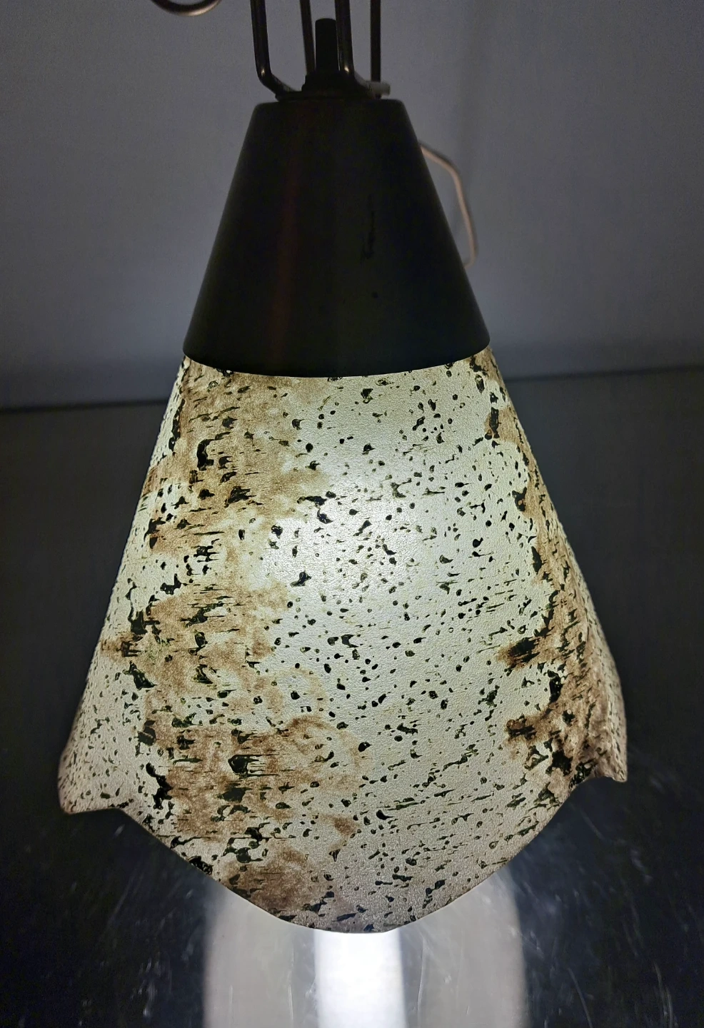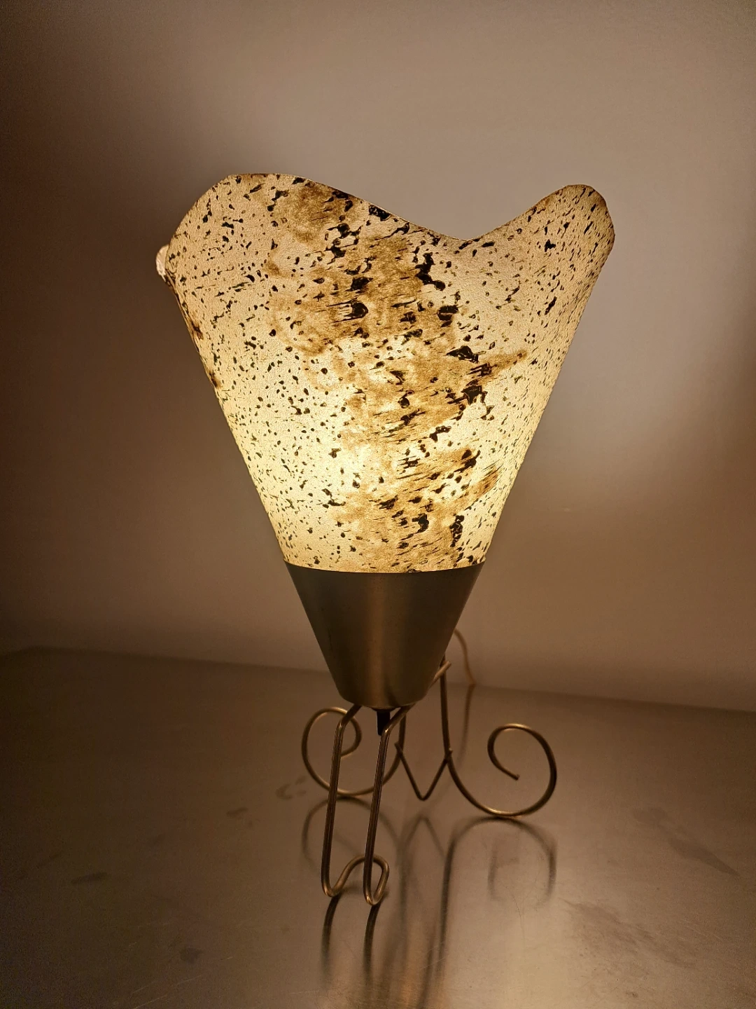 Here's a stylish MCM accent lamp or wall sconce with a unique vintage vibe! It features a cone-shaped fiberglass shade with a mottled pattern, complemented by a brass-coloured base with decorative swirls. It's perfect for adding a touch of retro charm to any room
